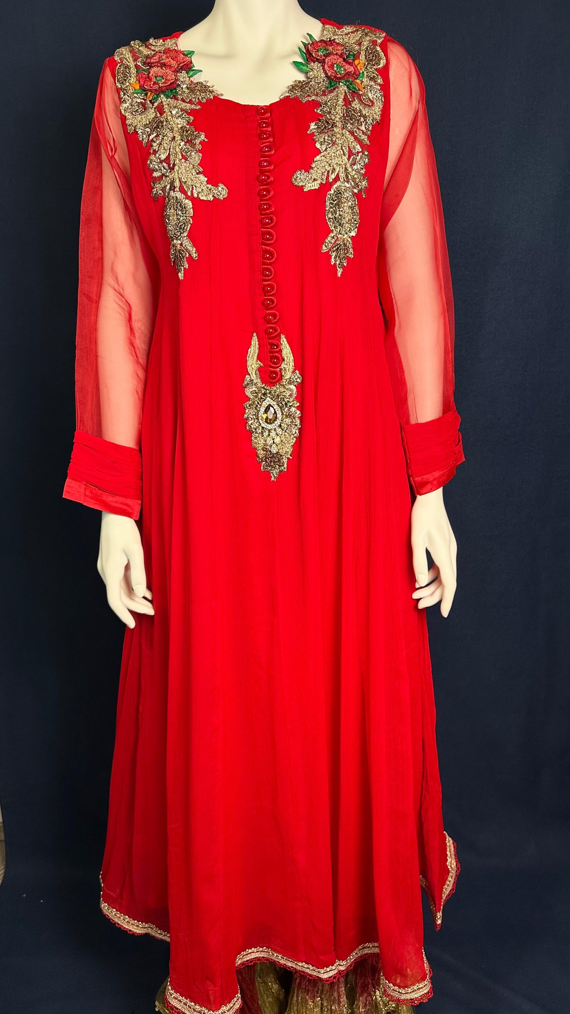 Turn heads with this vibrant red festive set from Khuda Baksh. The bold red hue radiates confidence and celebration, while the green dupatta with golden accents adds a touch of tradition and richness. Intricate floral detailing around the neckline and the elegant embellishments on the front complete the regal look. Perfect for cultural events, family celebrations, and festive occasions.