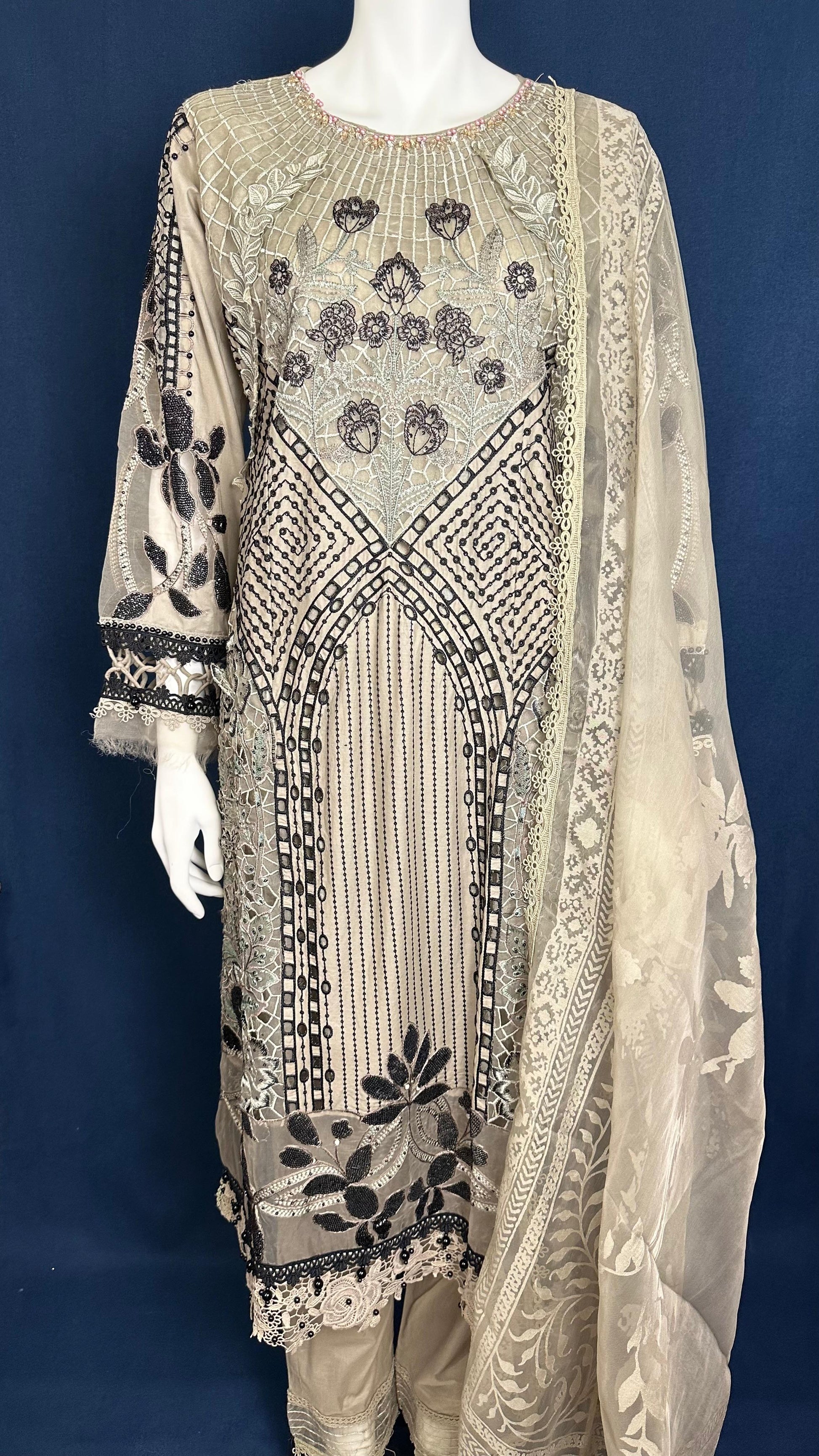 Este elegante conjunto de tres piezas en tonos beige suave y negro intenso ofrece el equilibrio perfecto entre sofisticación y estilo. Los patrones detallados y el brillo sutil le dan al conjunto una apariencia elegante, perfecta tanto para el día como para la noche.