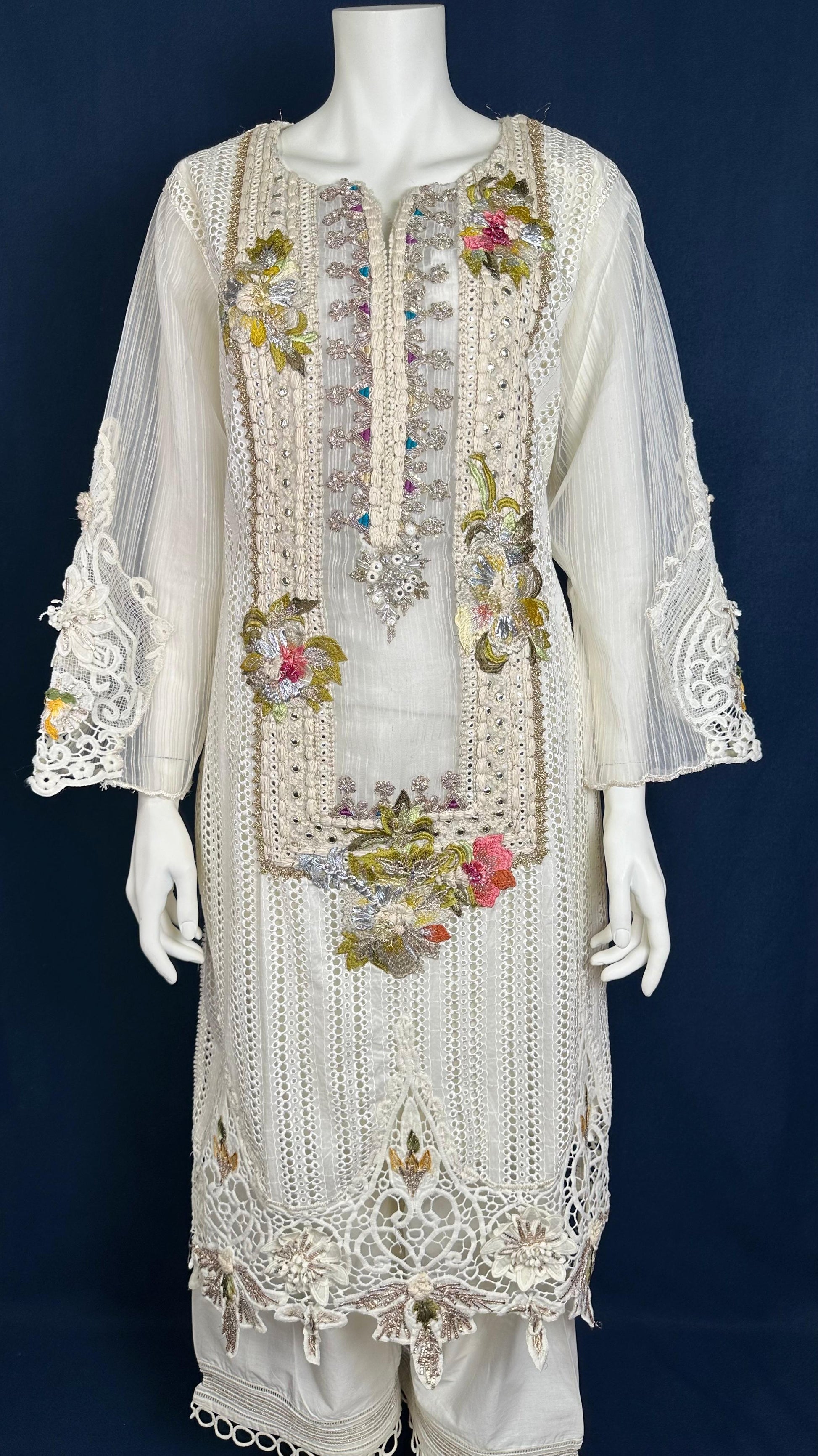Un conjunto de tres piezas en suave tono marfil de Khuda Baksh, decorado con vibrantes detalles florales en tonos pastel y delicados detalles en las mangas y el bajo. Una opción perfecta para elegantes reuniones de verano y ocasiones especiales.