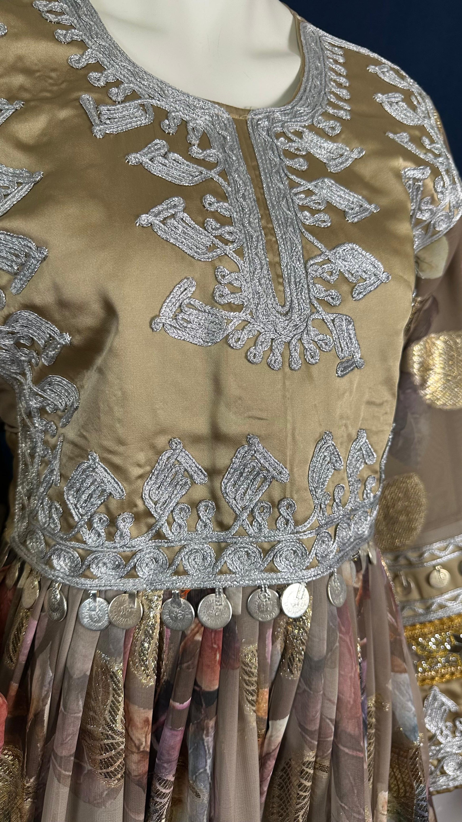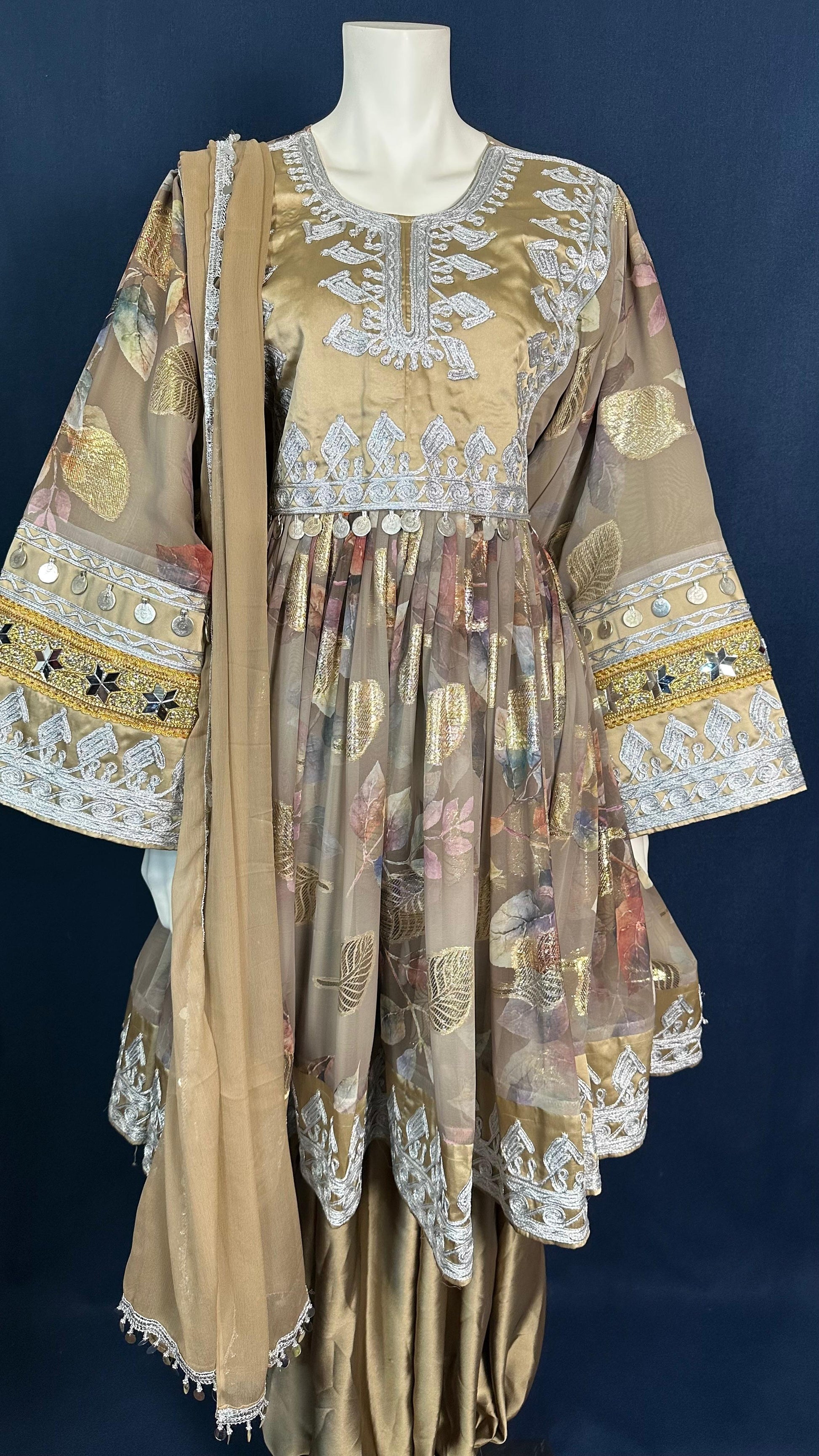 This beige Afghan dress combines earthy tones with soft silver-white detailing. The floral elements and elegant design give it a calm yet luxurious character, making it perfect for both festive occasions and cultural gatherings.