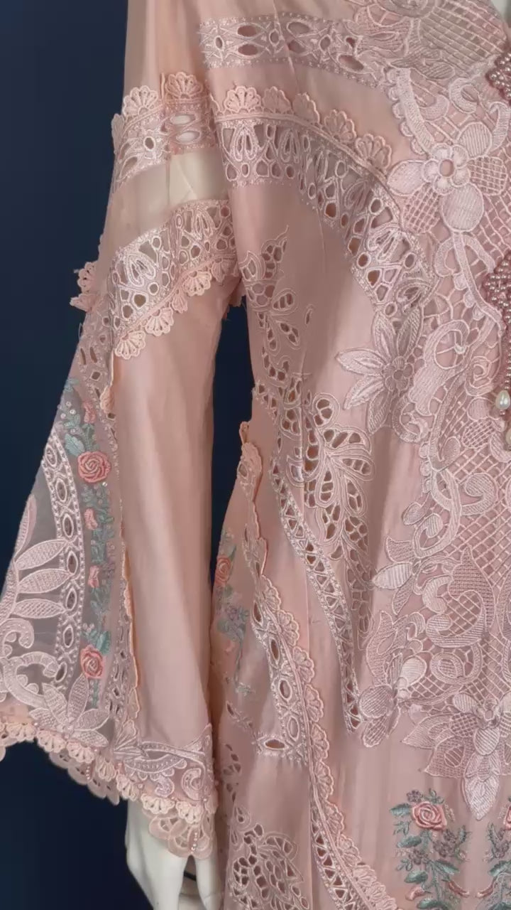 A delicate 3-piece set in soft blush tones that speaks of elegance and grace. The floral patterns and light flow make it the perfect choice for spring gatherings, daytime celebrations, or Eid festivities with a romantic touch.