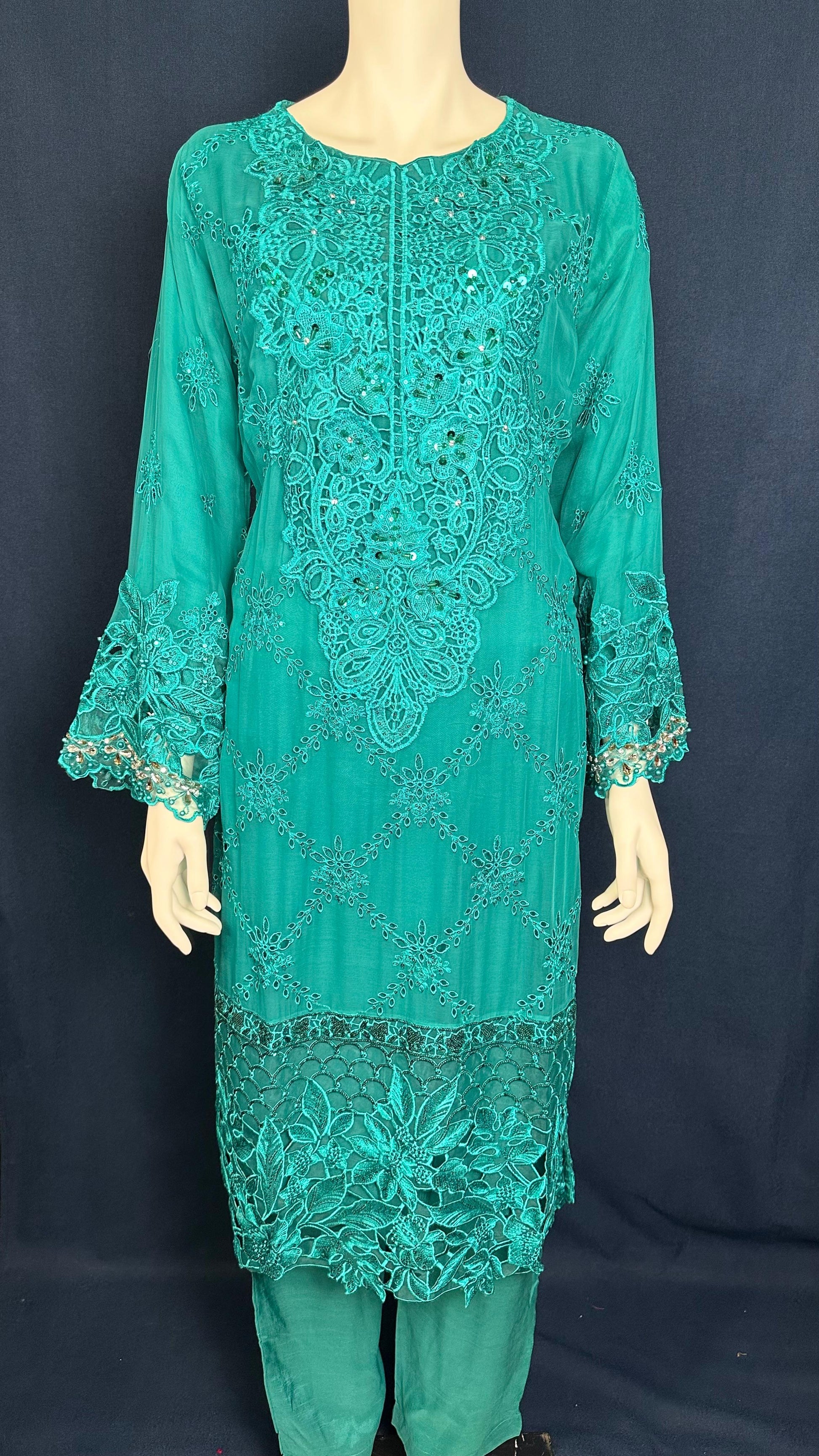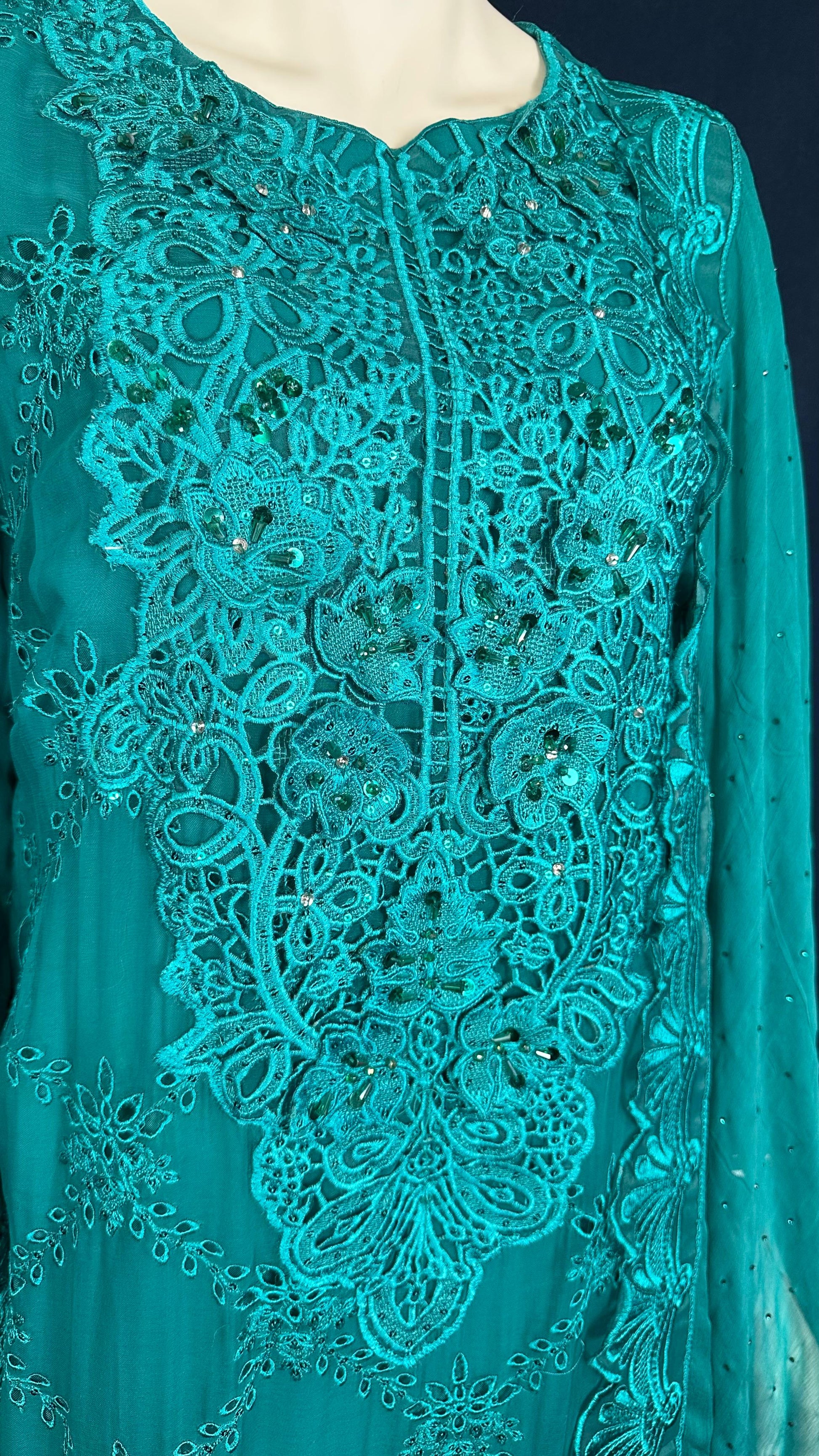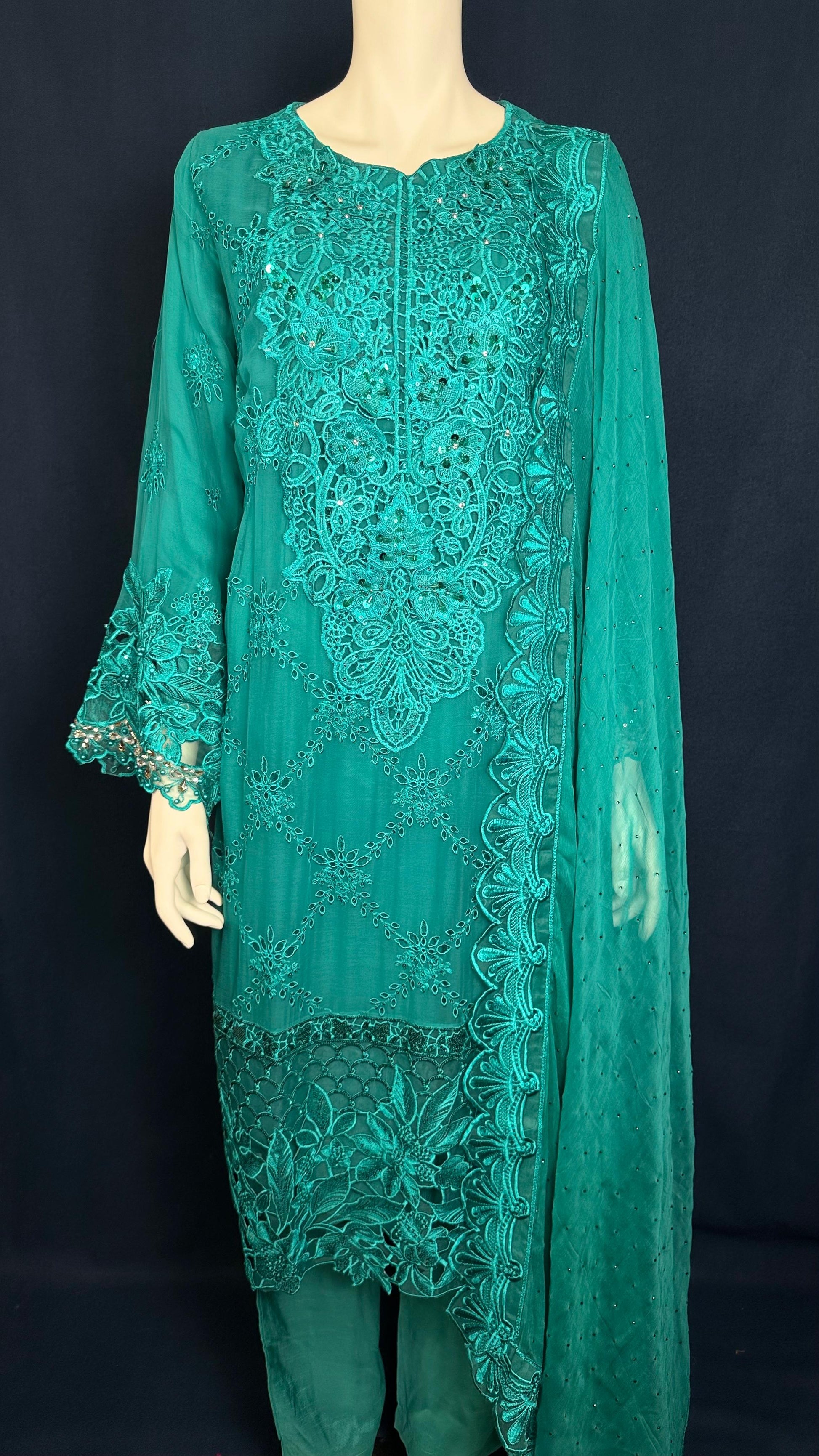 A rich emerald green 3-piece outfit with captivating ornamental patterns and a matching flowing dupatta. The bold color and fine detailing make this set a perfect choice for festive gatherings or elegant occasions.