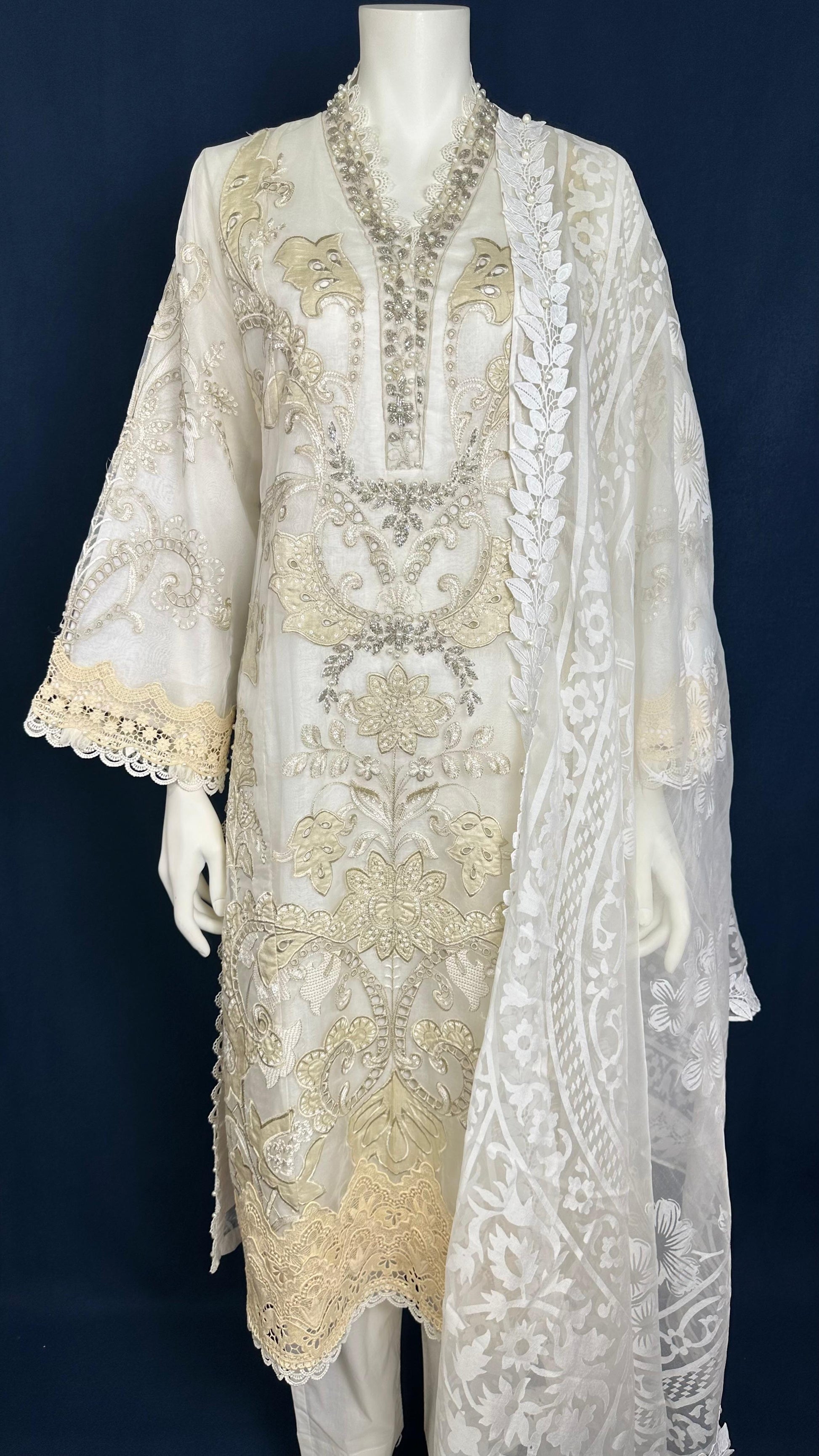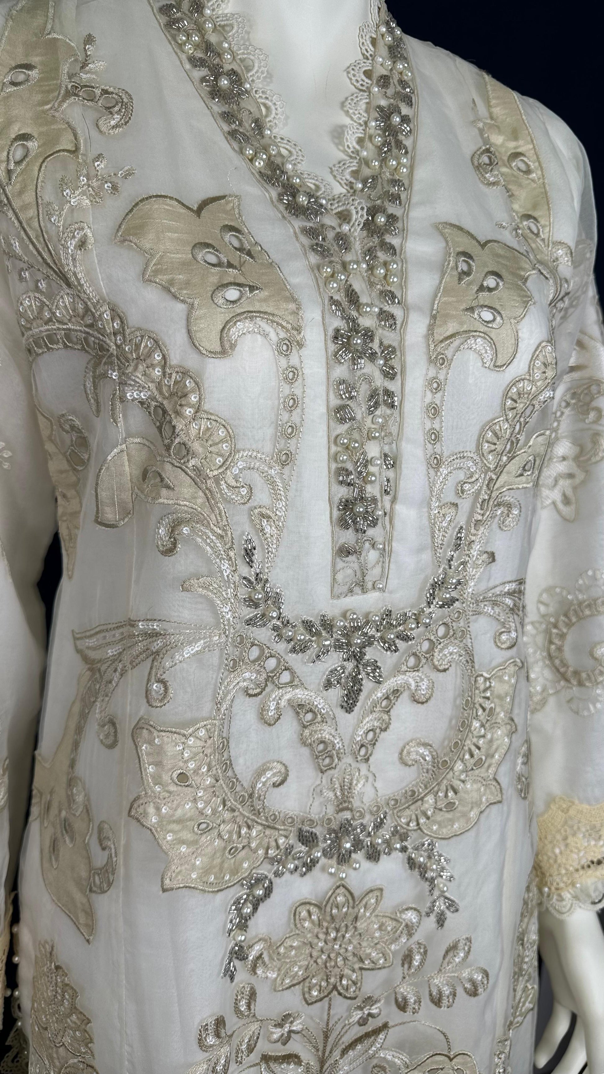 An elegant 3-piece outfit in ivory tones with golden detailing. The overall look is timeless and graceful – perfect for weddings, religious celebrations, or any event that calls for refined beauty.
