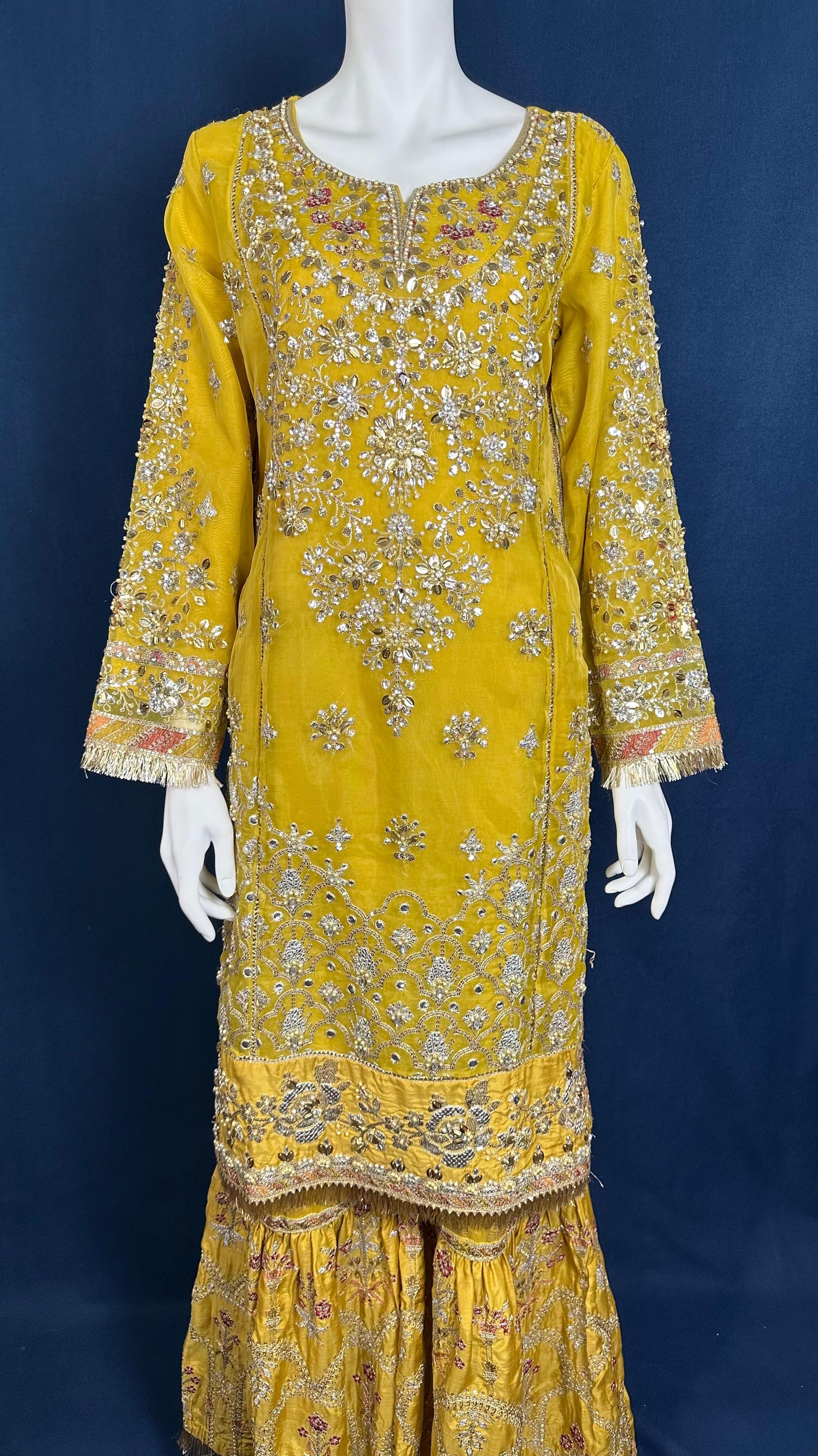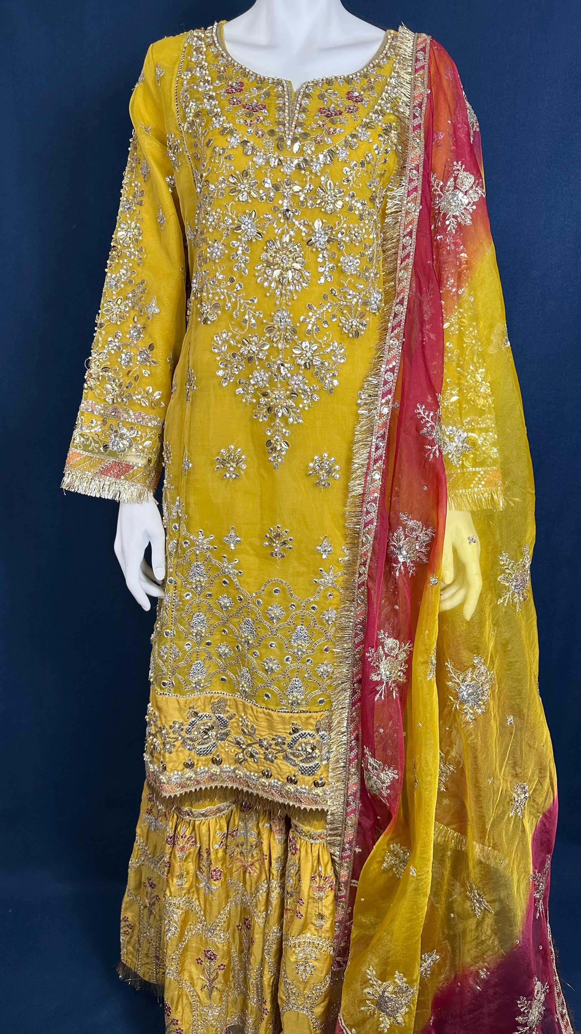 This vibrant 3-piece ensemble in rich yellow shines with dazzling floral detailing and a statement dupatta in a fiery gradient of red and gold. A captivating design that adds festive elegance to every celebration.