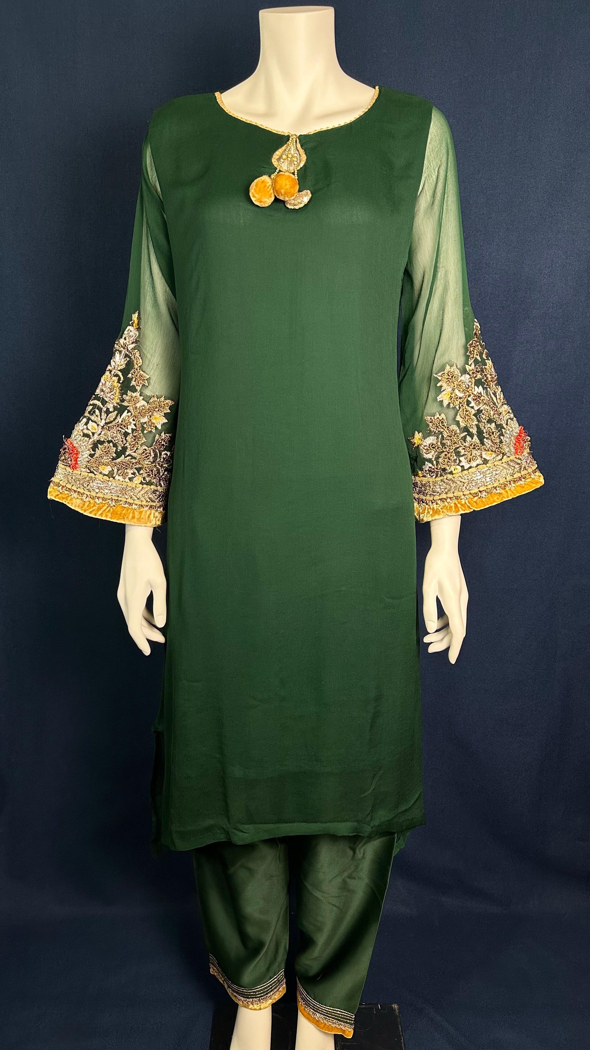 Step into refined elegance with M-100 Green by Khuda Baksh, a timeless 3-piece outfit in deep forest green. The golden dupatta brings a luminous accent, while the flowing silhouette ensures graceful movement. Ideal for festive gatherings and formal occasions.