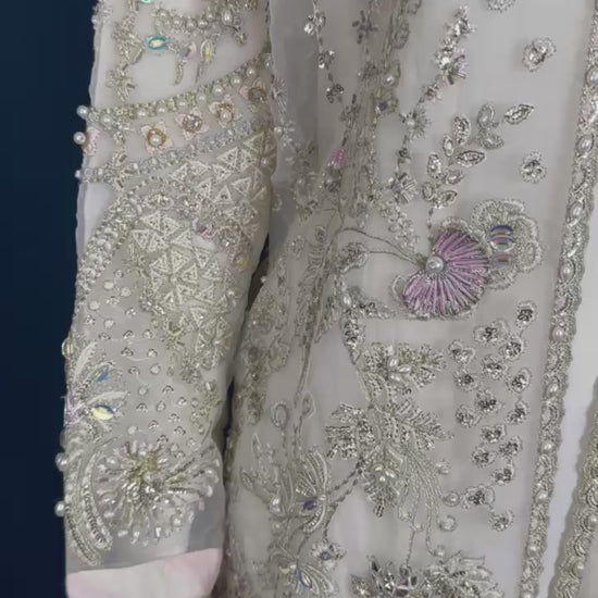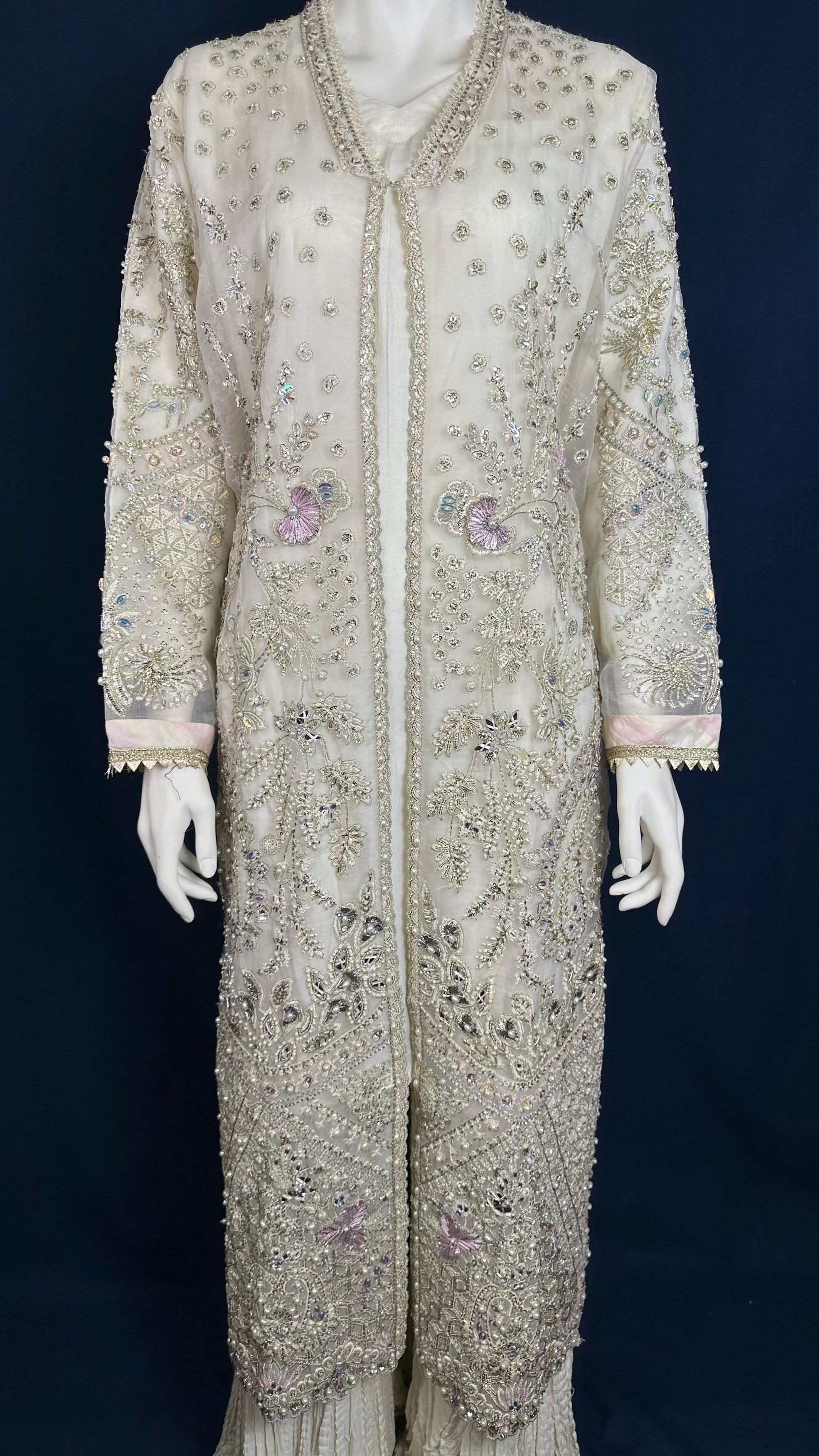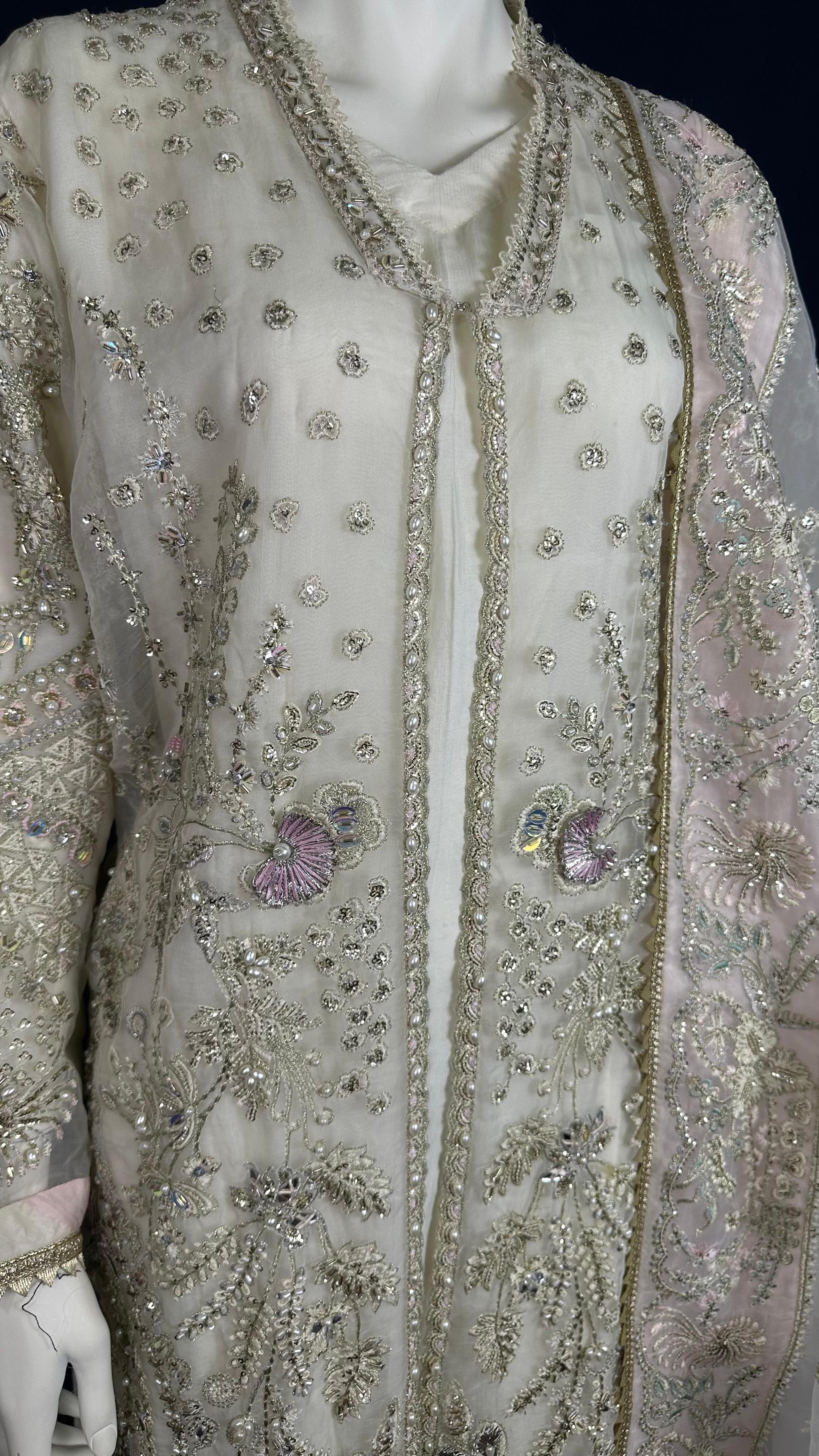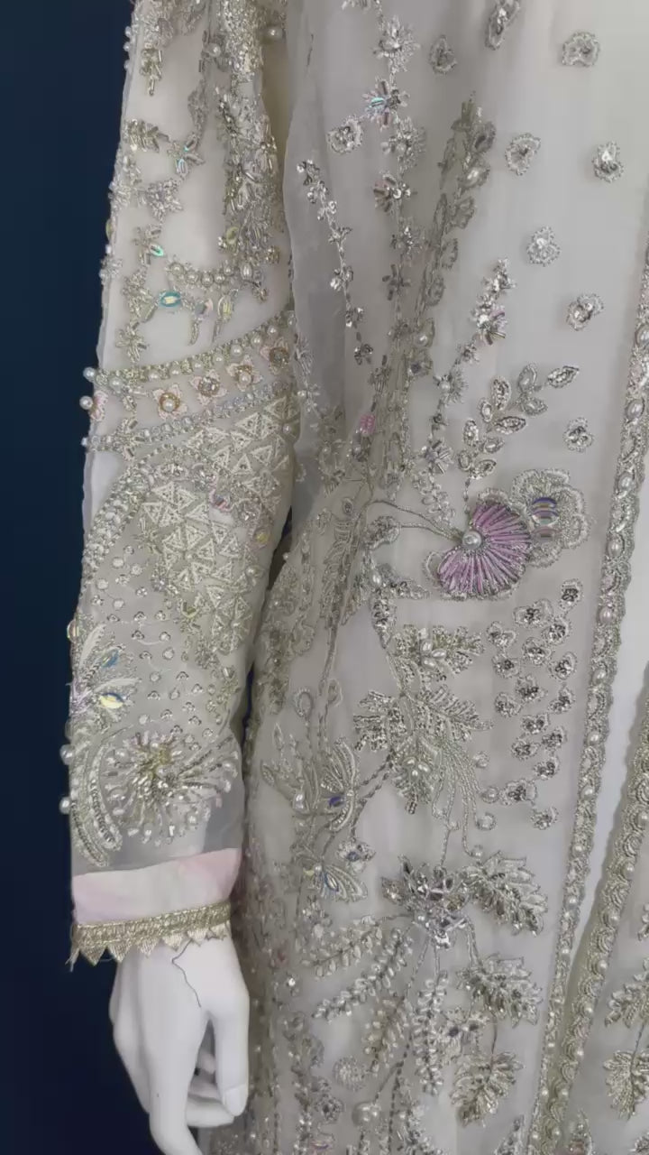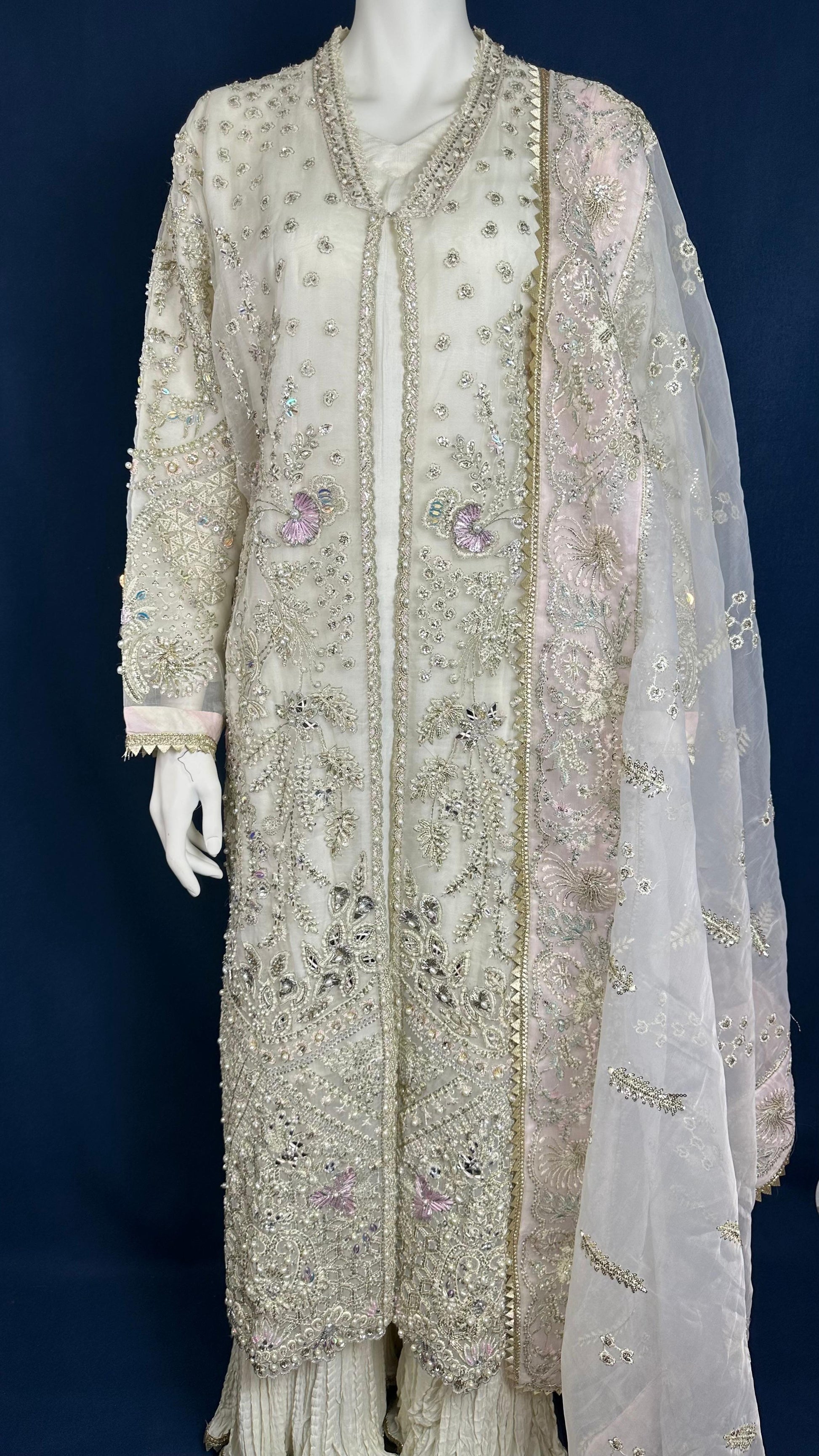 An enchanting 3-piece ensemble in soft white tones, adorned with sparkling details and hints of blush. The graceful silhouette paired with the delicate dupatta makes it a timeless choice for special occasions and elegant evenings.