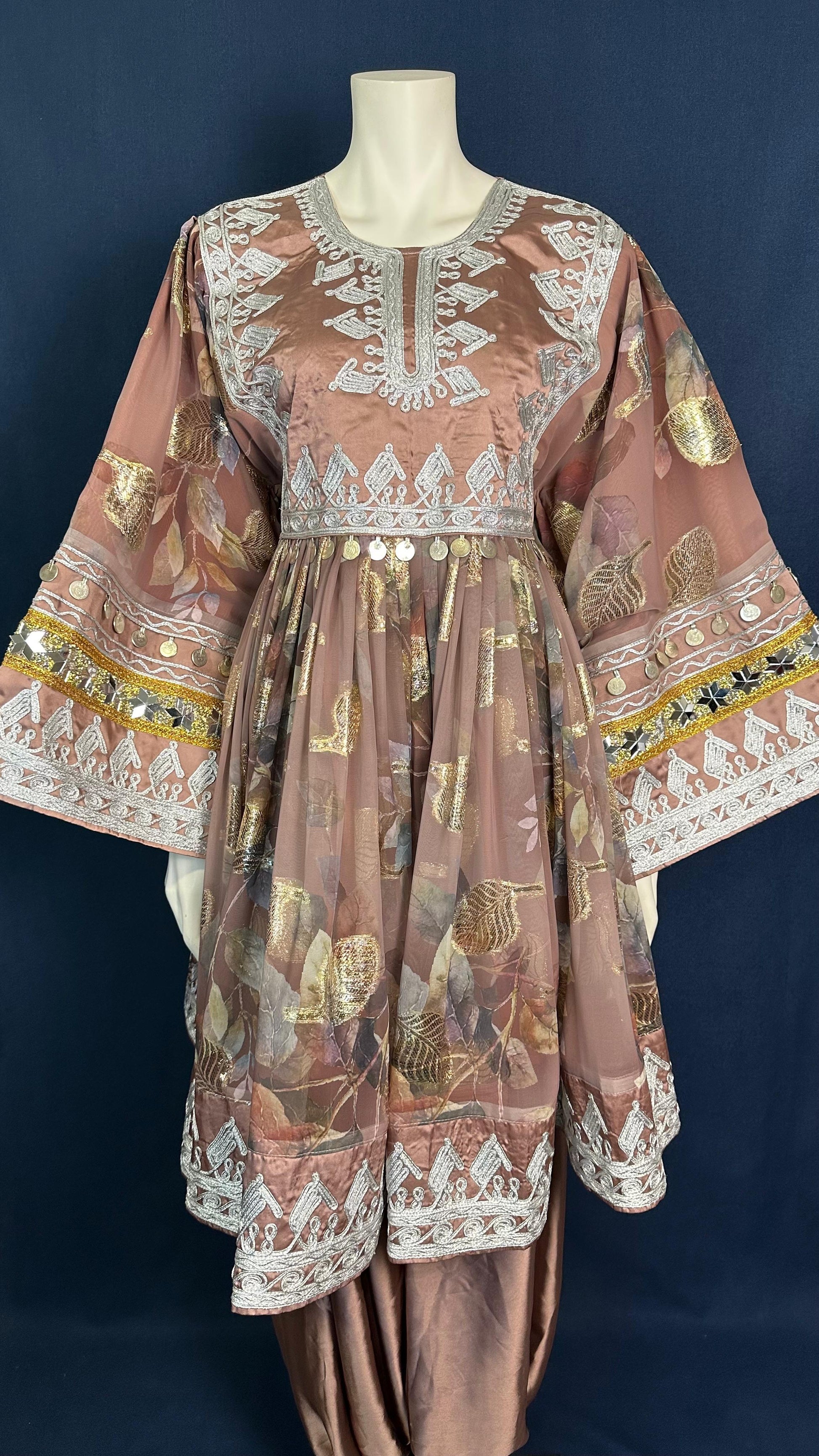 This rosy brown Afghan dress is adorned with subtle silver highlights and soft leaf patterns. The overall look is elegant and timeless, ideal for cultural events or festive gatherings.
