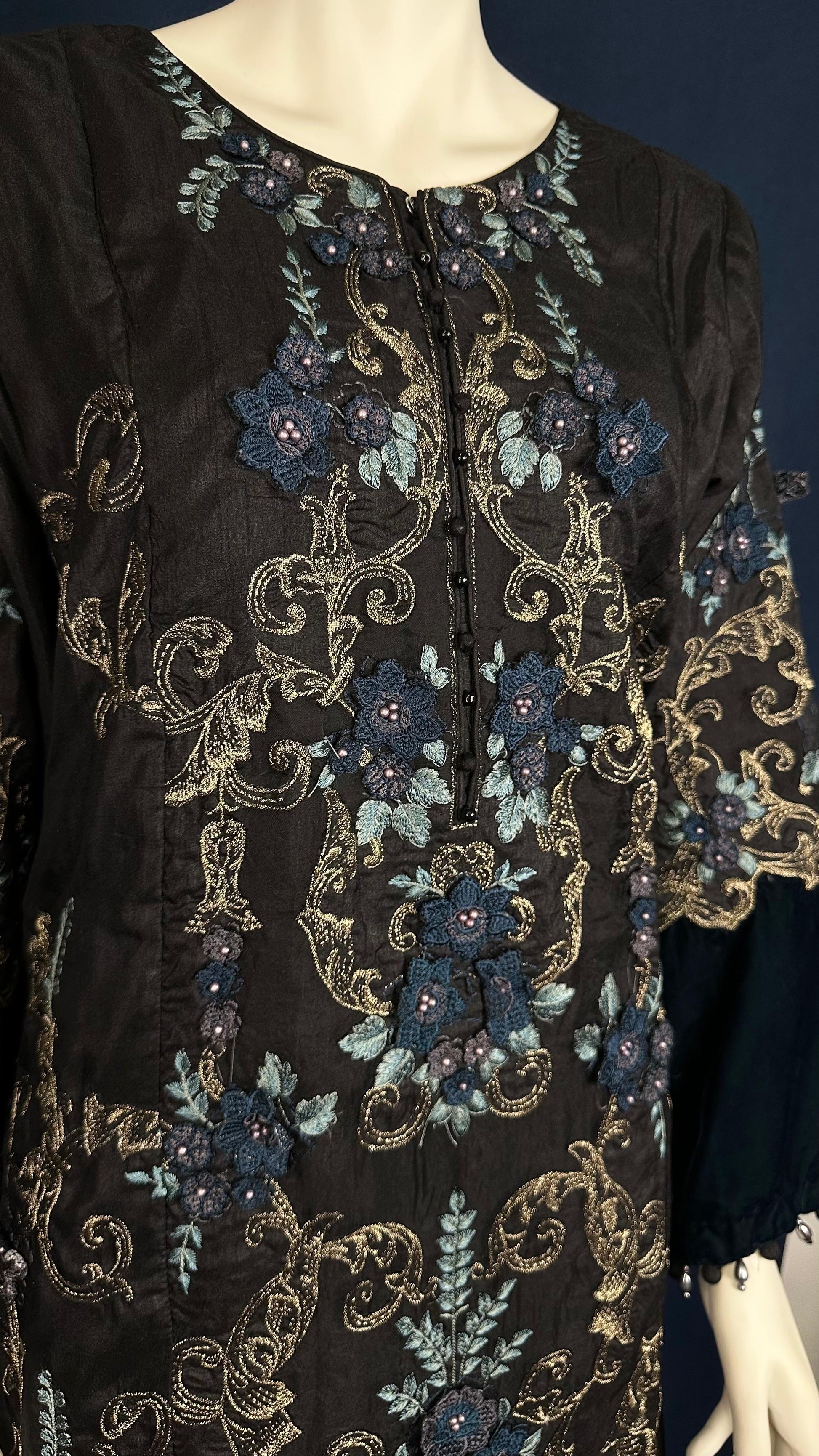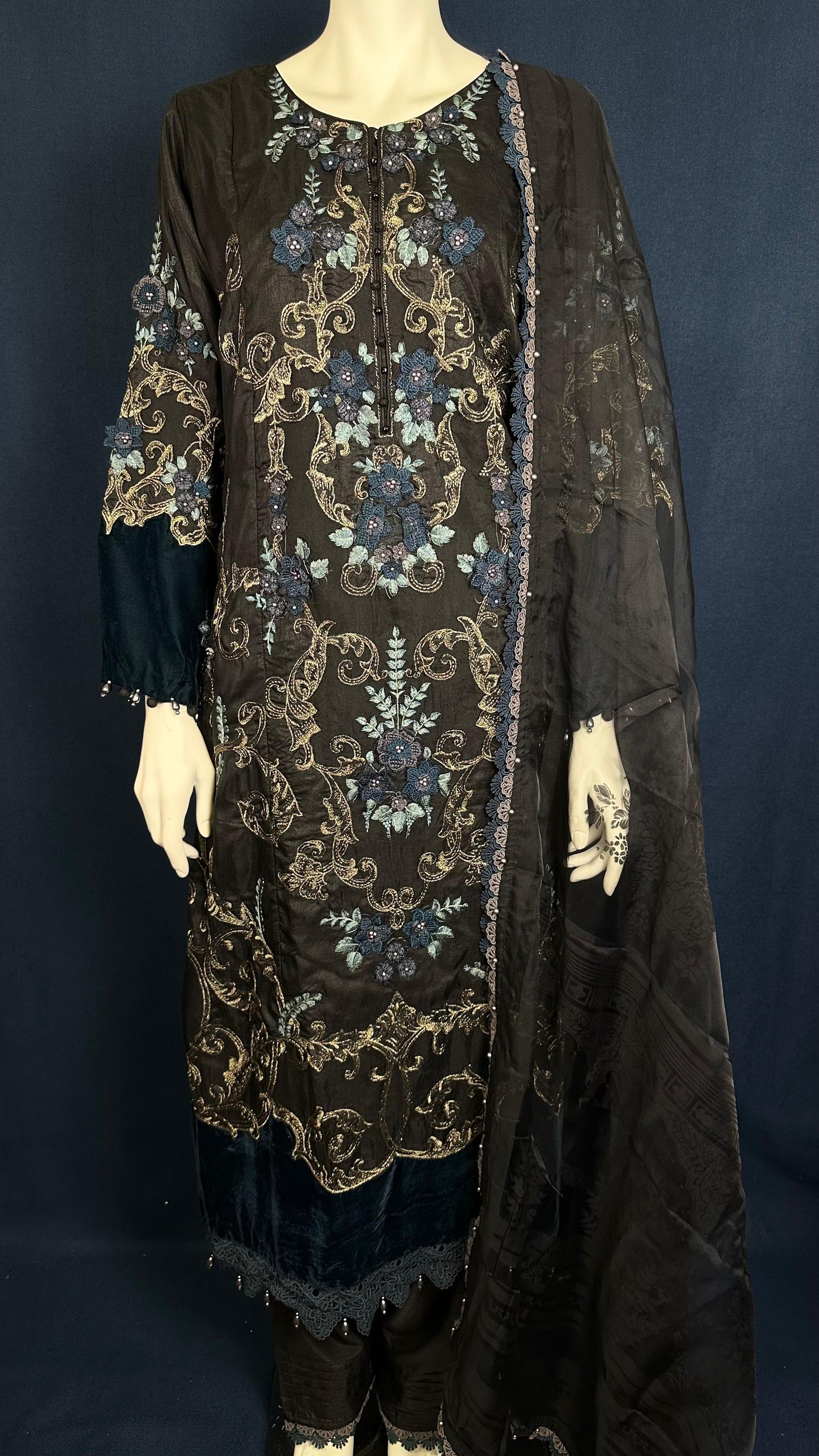A refined 3-piece outfit in deep black, gracefully accented with shades of blue and gold. The design features detailed floral patterns, decorative borders, and elegant contrast elements, making it perfect for festive evenings or formal celebrations.
