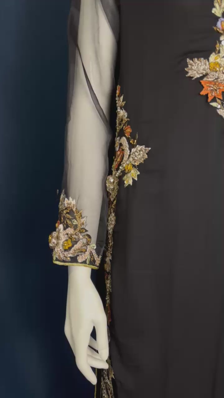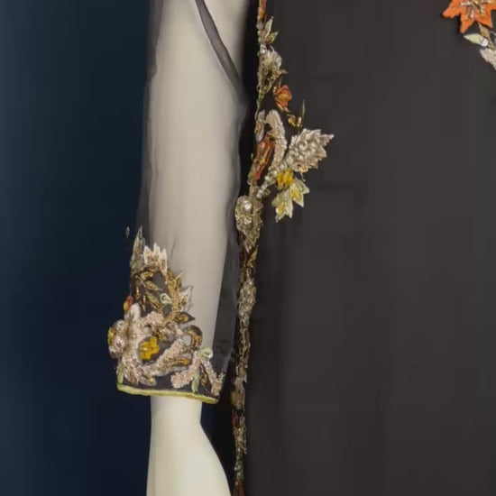 Step into timeless elegance with Noor Noir by Khuda Baksh, a stunning black 3-piece outfit adorned with golden floral accents and a sheer embroidered dupatta. Perfect for evening events and festive occasions.