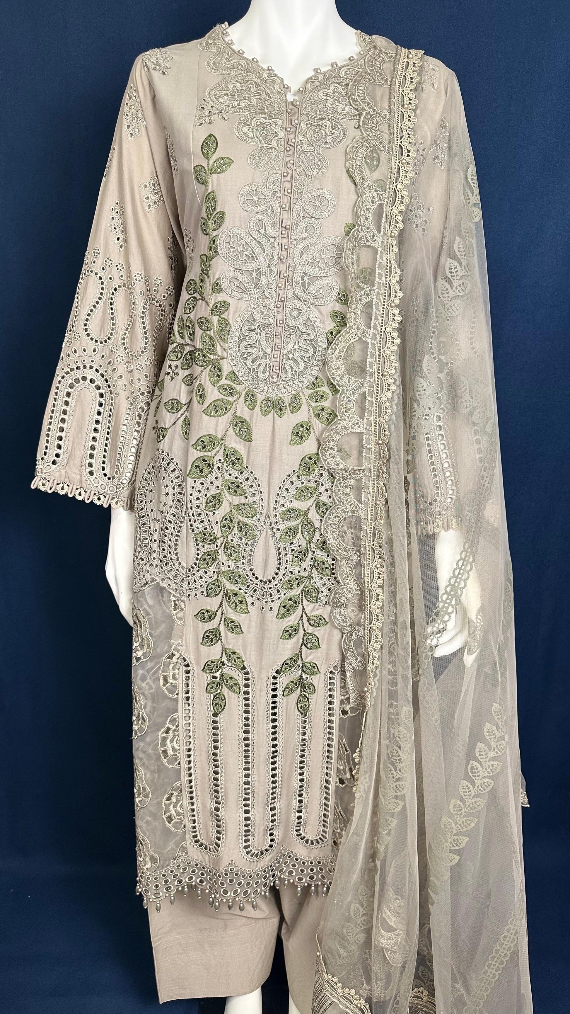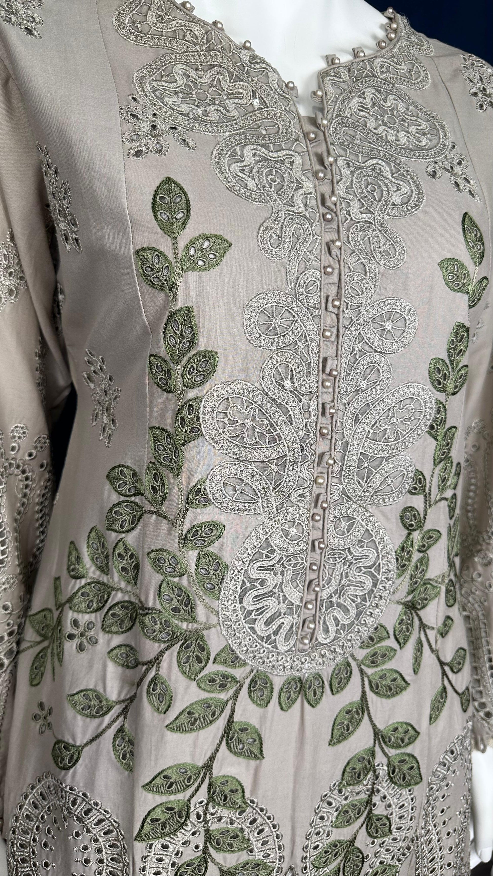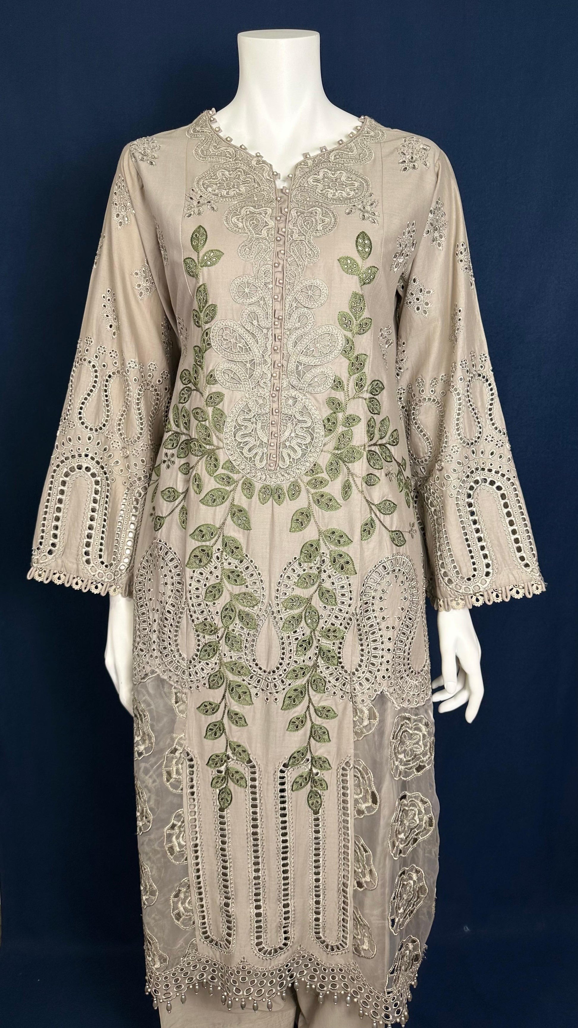 A subtle yet elegant ensemble in soft beige with olive-toned accents. This outfit creates a calm and refined look that suits daytime gatherings, formal lunches, or graceful festivities. Its neutral tones make it a versatile must-have in any wardrobe.