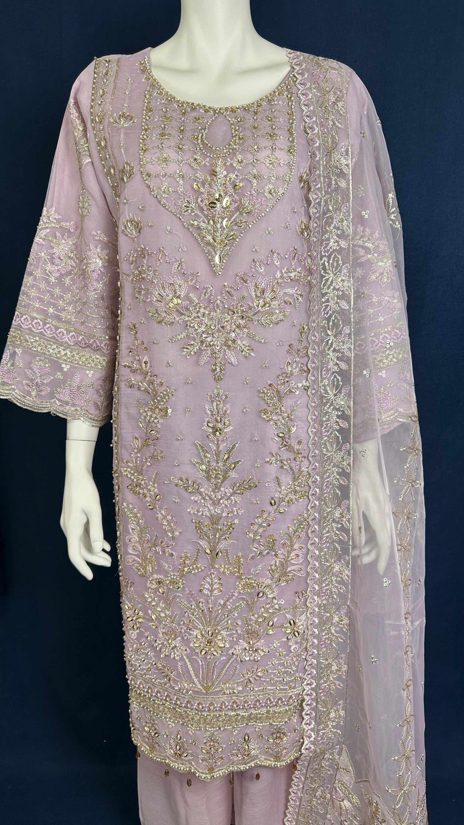 A luxurious 3-piece suit in muted lavender with shimmering golden details. The elegant design and coordinated dupatta create a look that’s perfect for celebrations, weddings, or formal evenings.