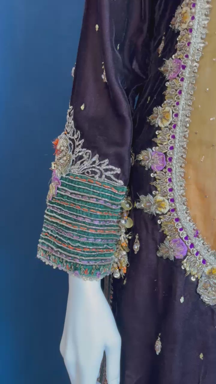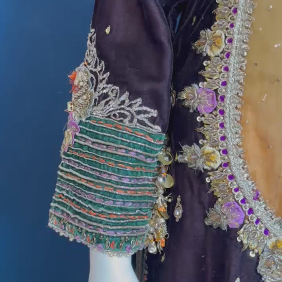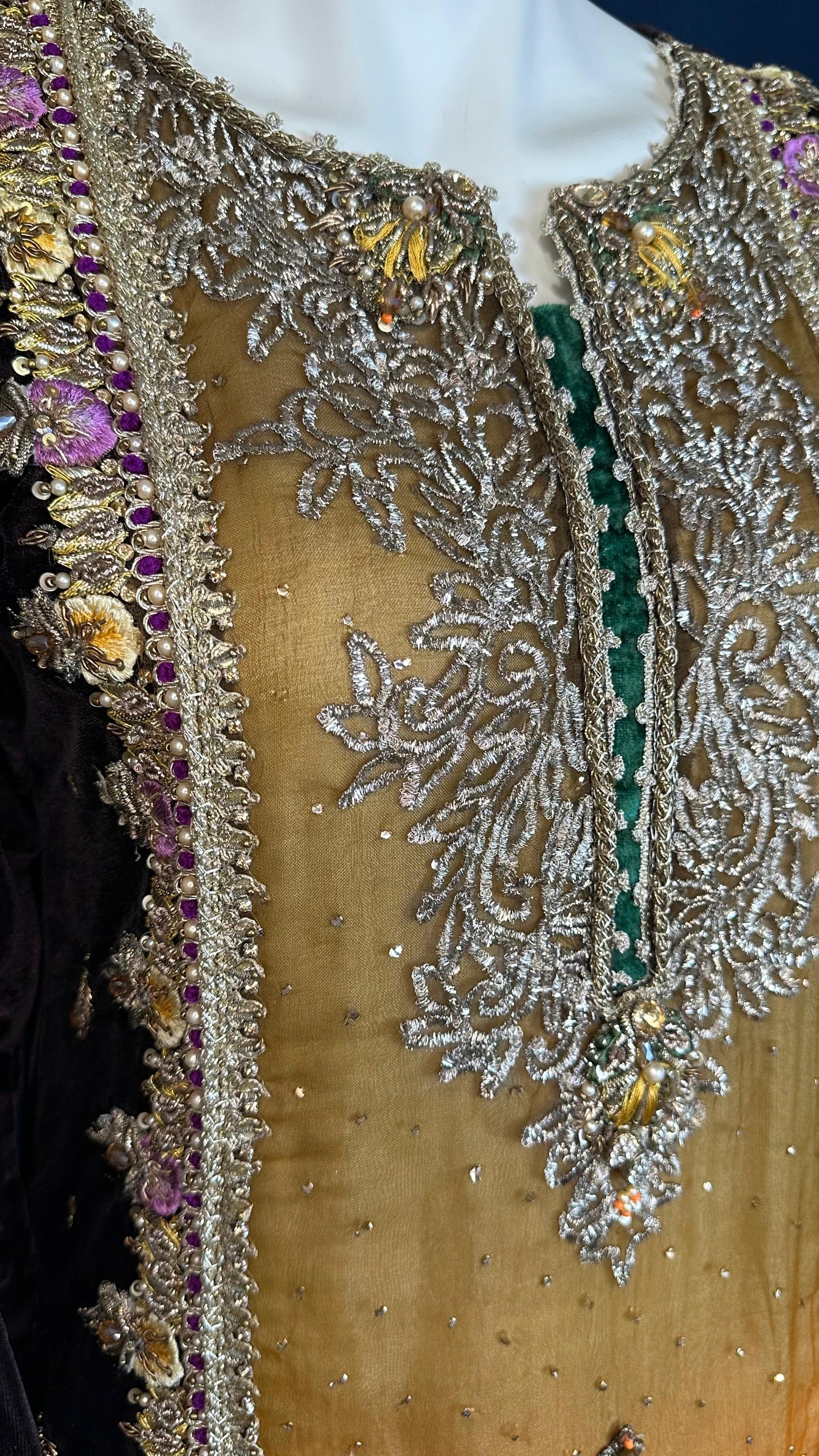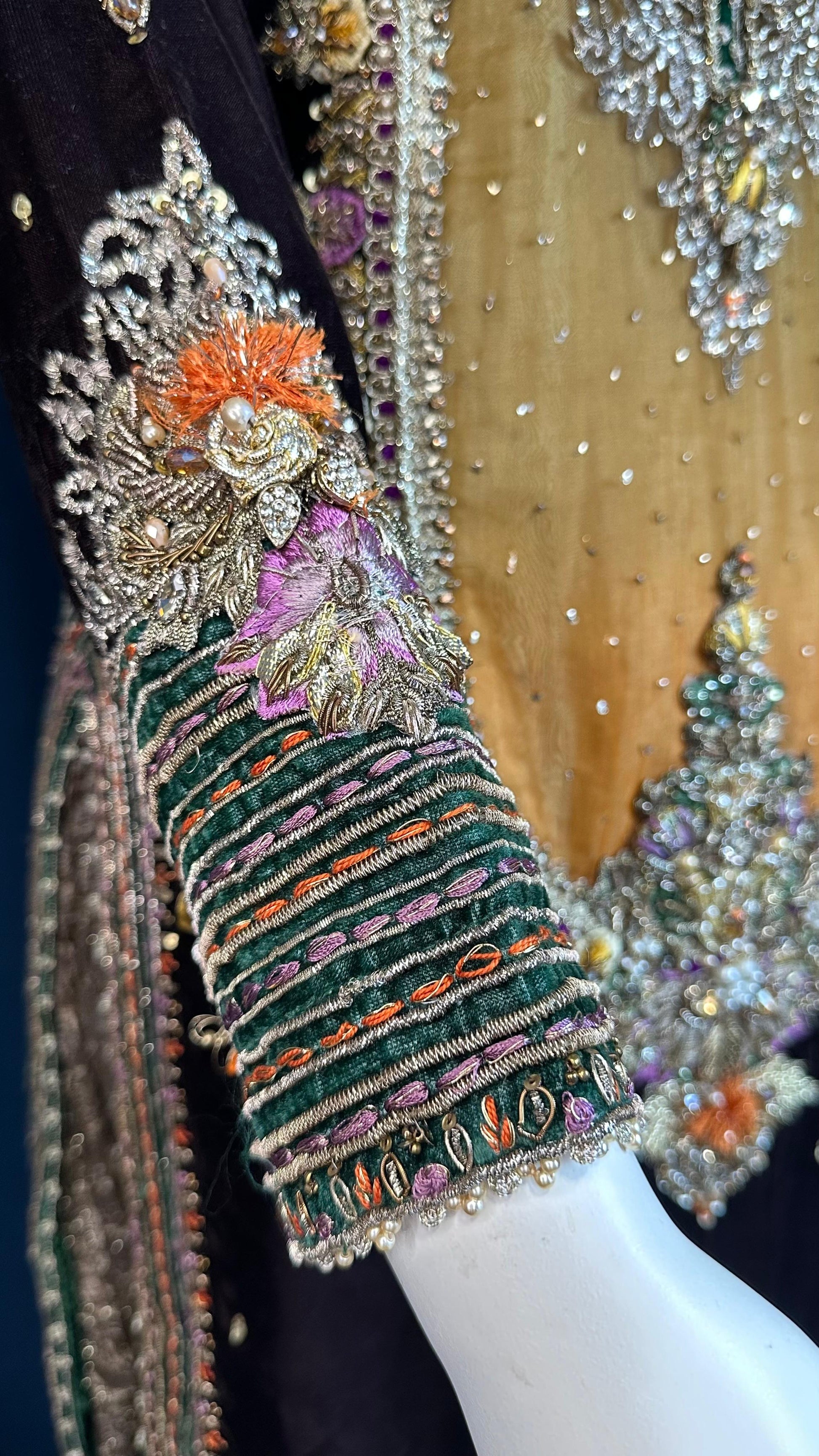 Step into refined elegance with P-265 by KB. This luxury 3-piece set in chocolate brown and gold features detailed embellishments, paired with a flowing green dupatta. Perfect for weddings, receptions, and festive occasions.