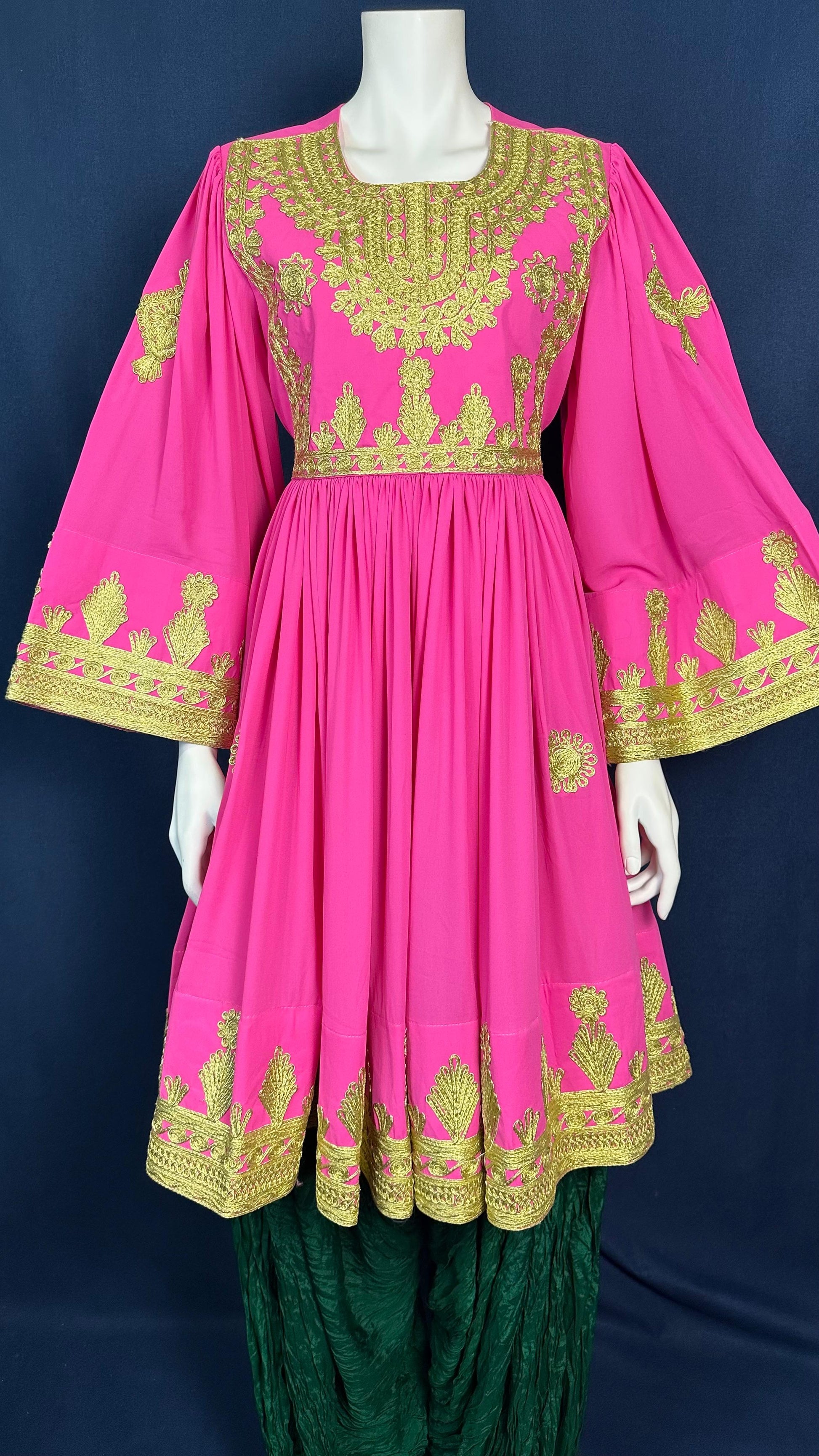 Vibrant pink Afghan dress with detailed golden patterns and a contrasting green scarf. A perfect choice for festive gatherings and traditional celebrations.