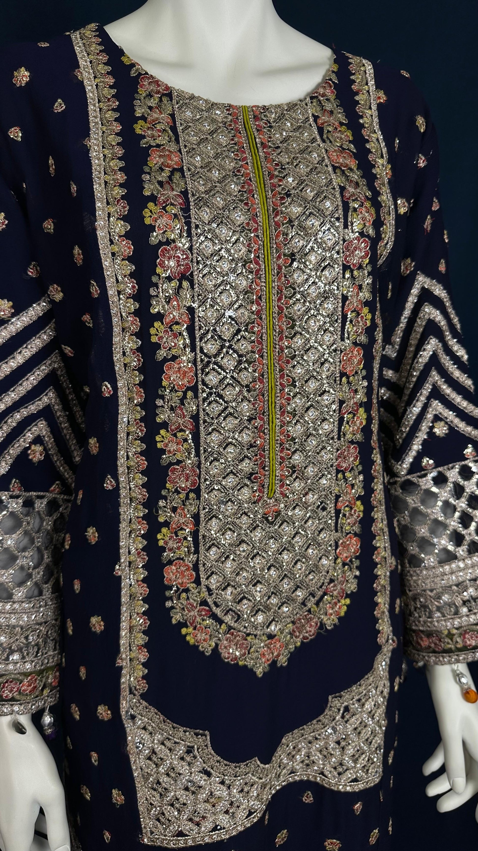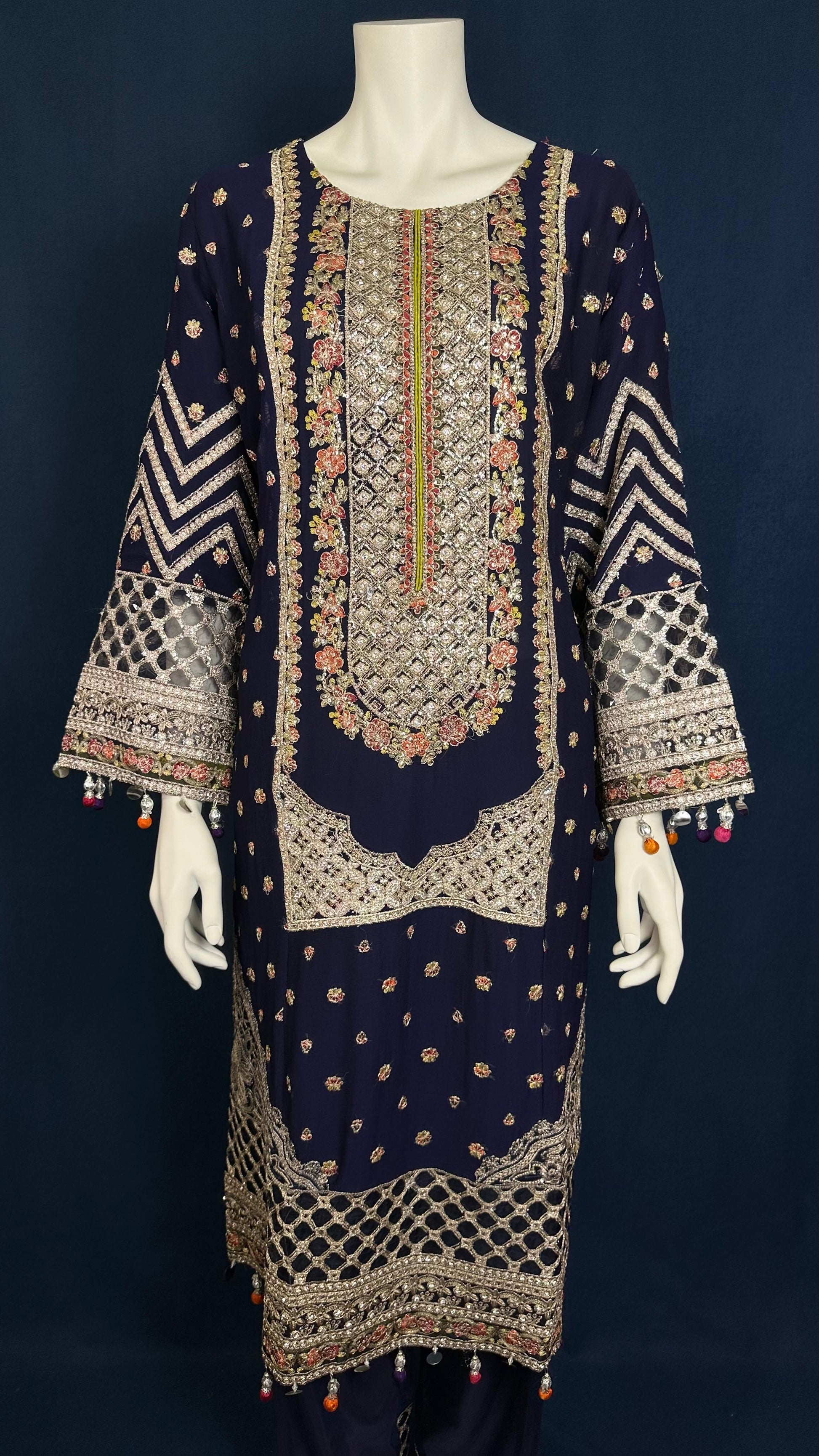 A majestic 3-piece outfit in deep navy blue, richly adorned with shimmering gold and multicolored detailing. The outfit features refined borders, intricate patterns, and colorful tassel accents that bring festive charm to life. Perfect for evening occasions and traditional gatherings.