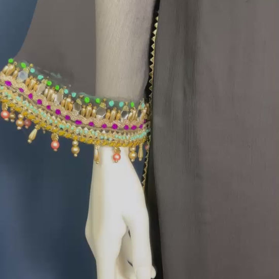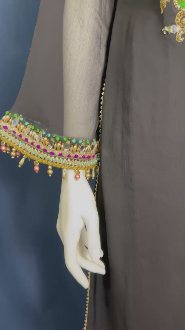 Stand out in Sahar Black by Khuda Baksh, a luxurious black outfit with colorful embroidery, shimmering gold highlights, and a sheer golden dupatta. Perfect for weddings and evening occasions.