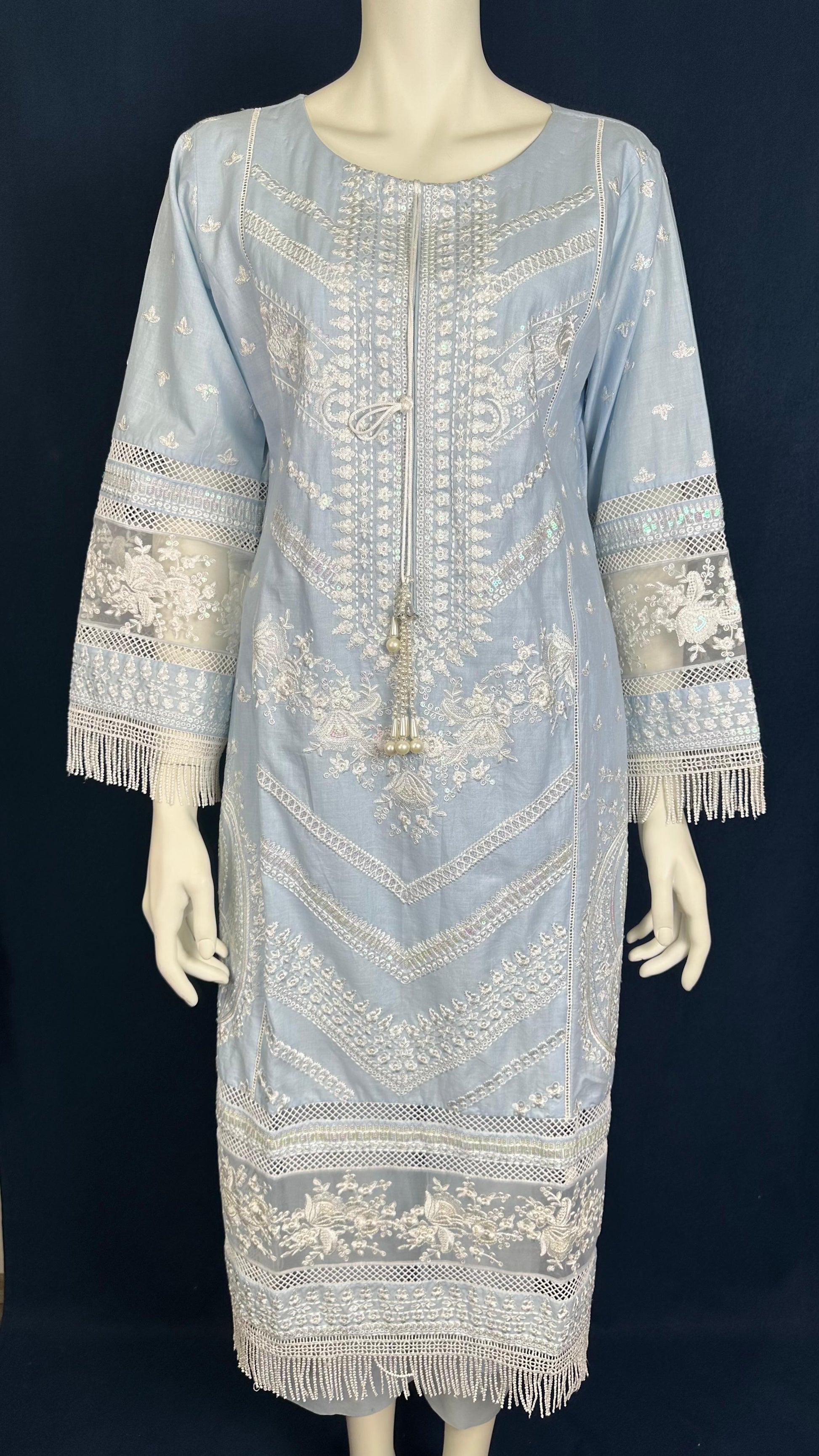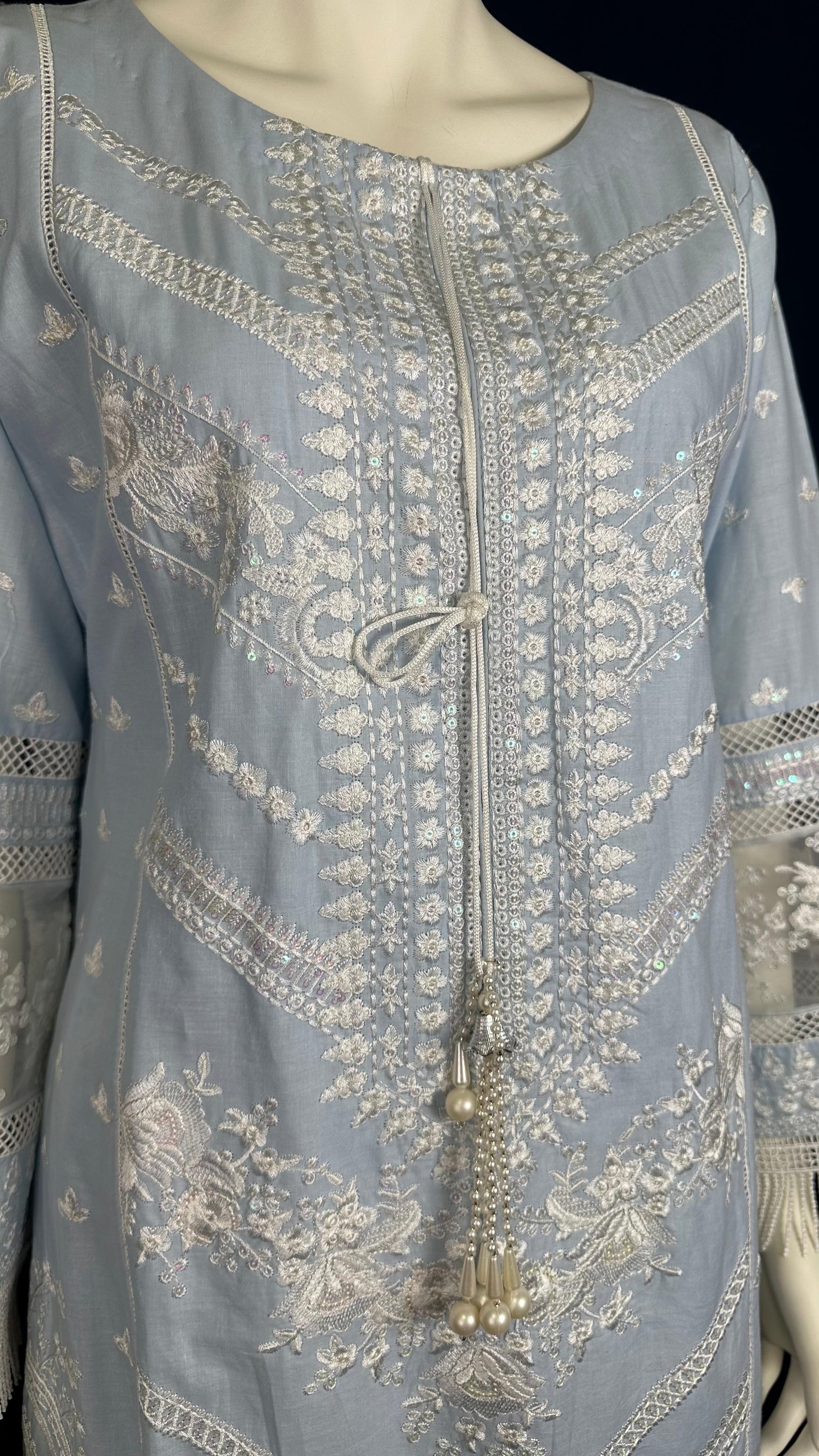 A refreshing 3-piece pastel set in sky blue, detailed with elegant white patterns and delicate tassels. The vibrant floral dupatta adds a playful and colorful contrast — perfect for garden gatherings, festive days, or light summer occasions.