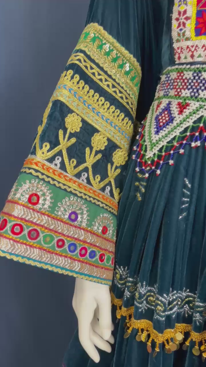 This traditional Afghan dress showcases bold patterns and vibrant color contrasts. The flared silhouette and decorative details make it ideal for weddings, celebrations, and cultural gatherings.