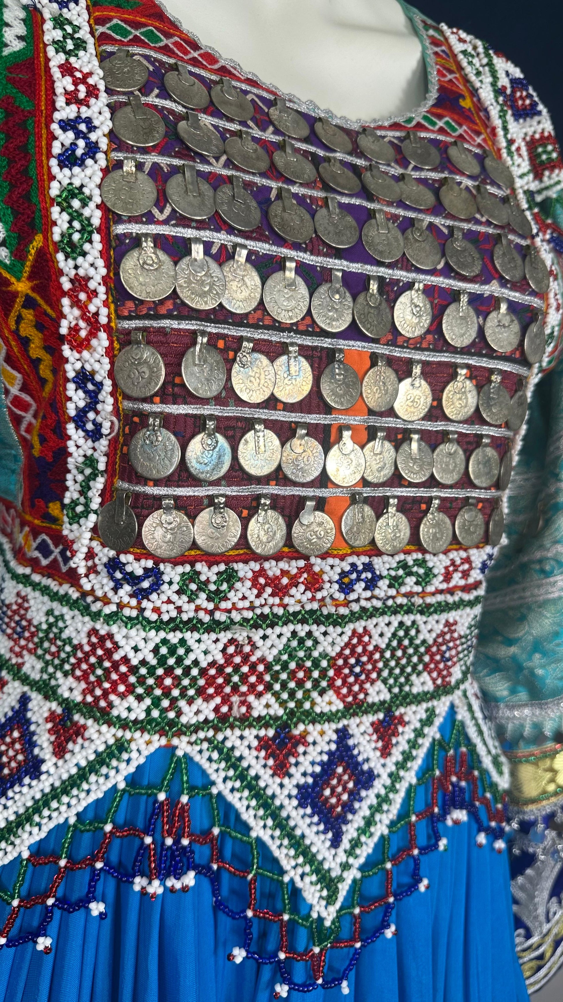 A striking traditional Afghan dress featuring a rich turquoise and royal blue color palette. The intricate design and flowing silhouette make it perfect for weddings, cultural events, or festive celebrations.