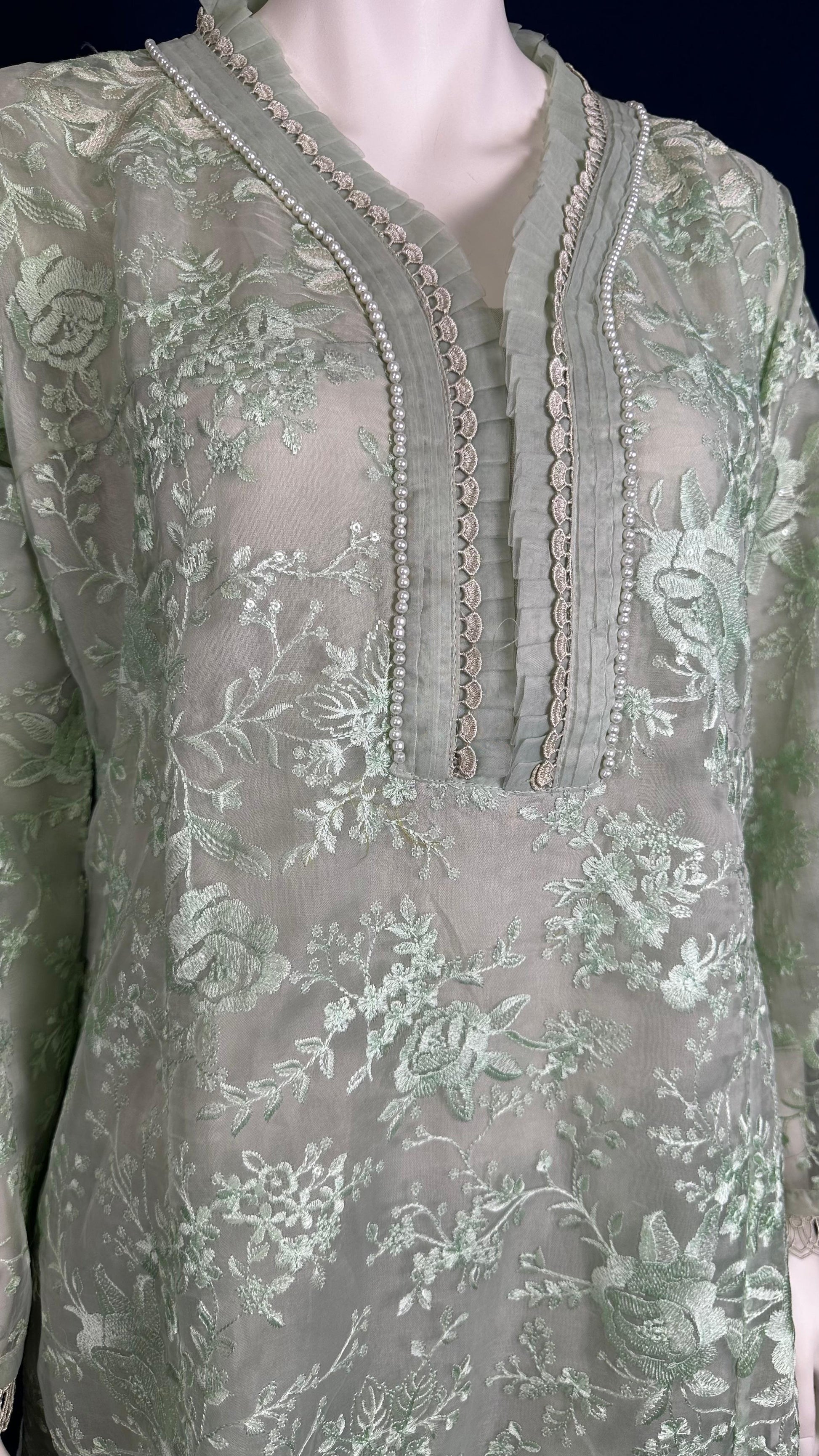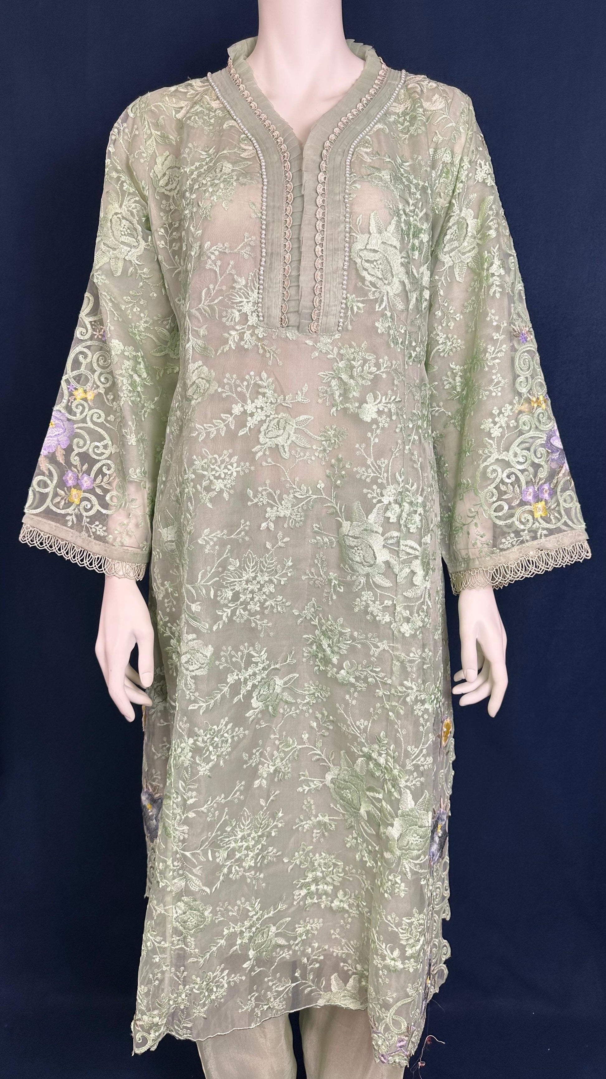 A graceful mint green 3-piece outfit decorated with delicate floral motifs in pastel tones. The flowing dupatta and soft color palette make it a refined choice for daytime events and spring gatherings.