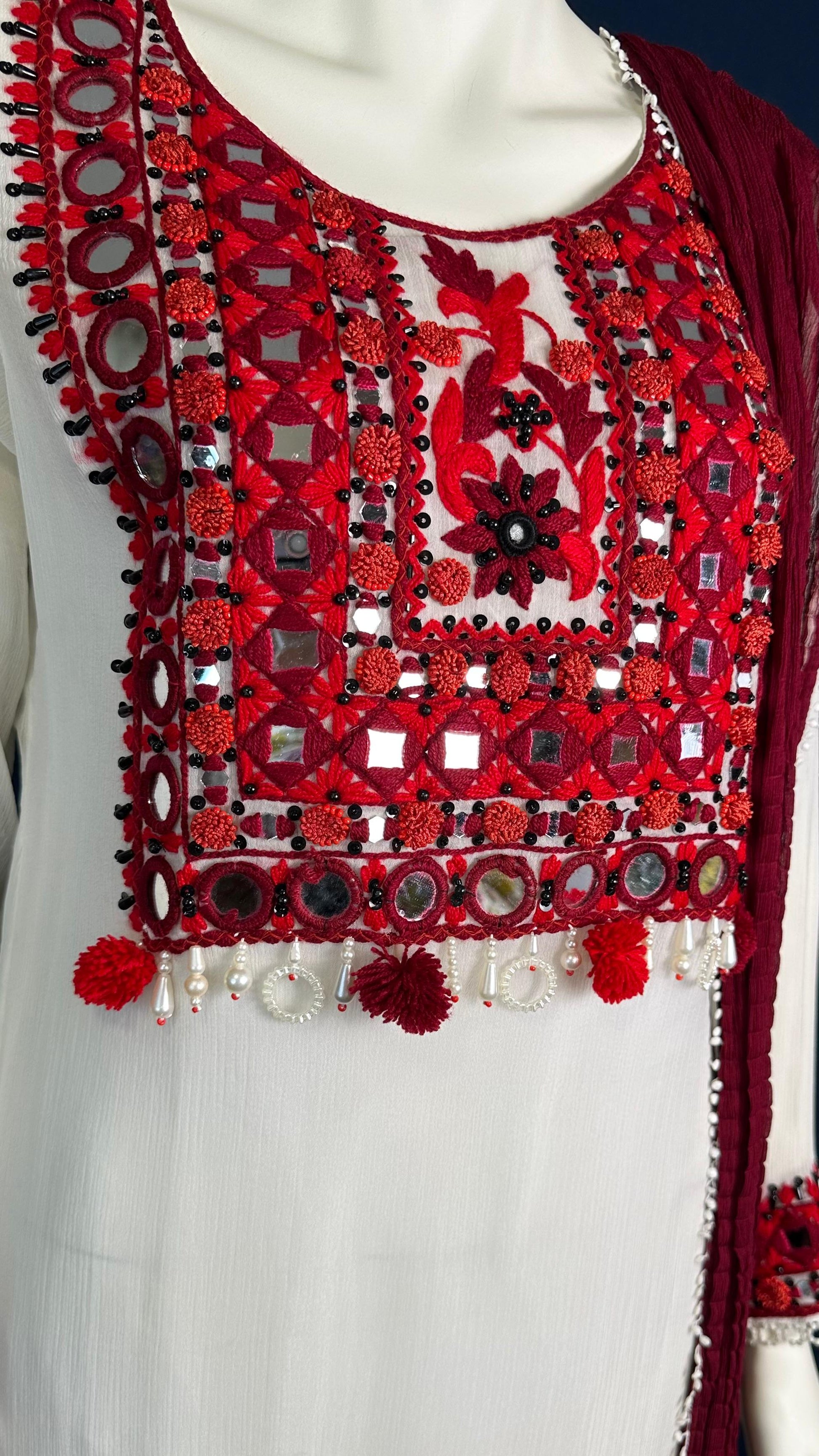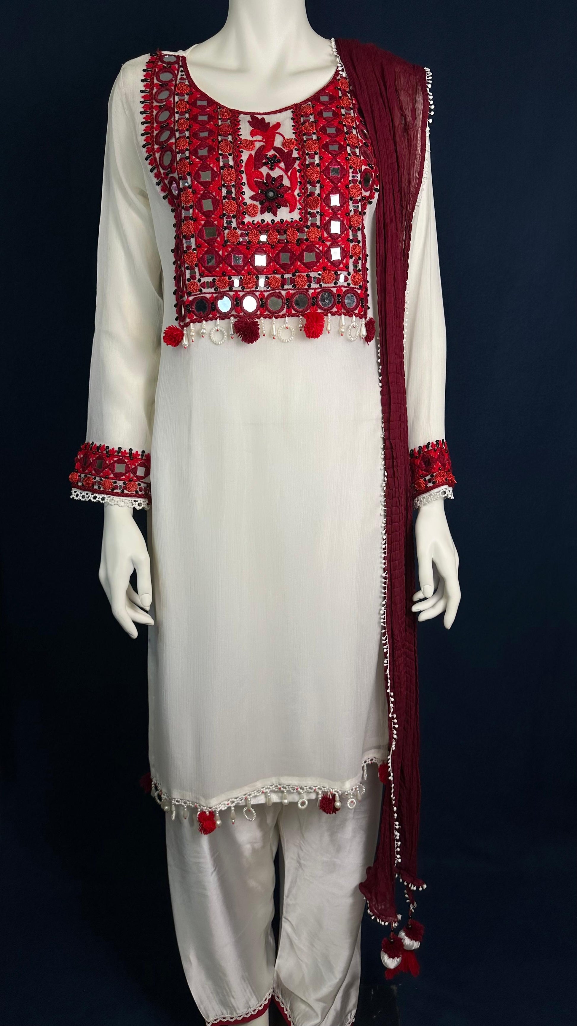 Radiate elegance with Z-297 White by Khuda Baksh – a bright 3-piece outfit featuring mirror accents, red embroidery, and playful tassels. The deep red dupatta adds a bold contrast to the soft white fabric. Perfect for weddings, festivals, and cultural events.