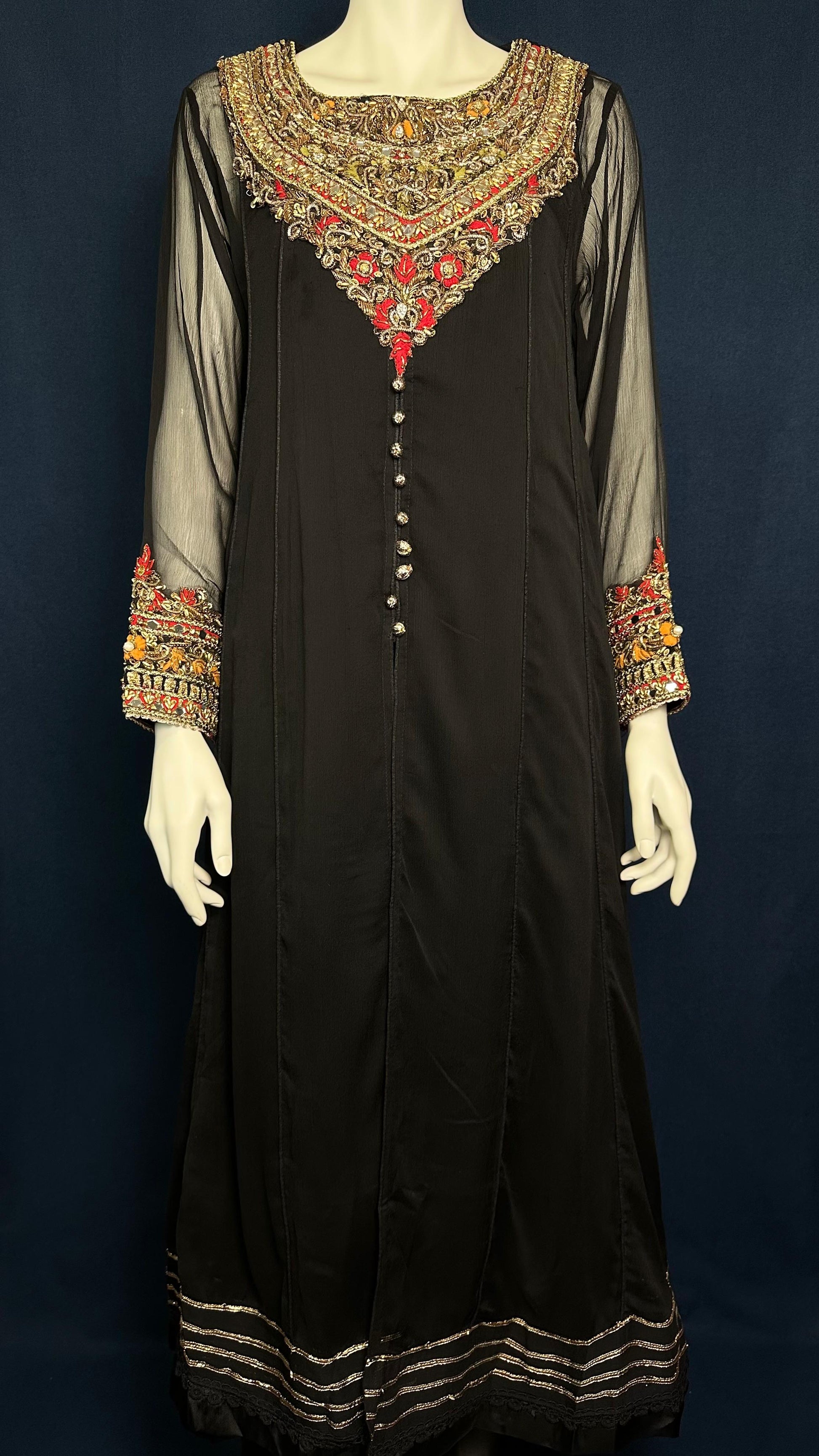 Experience elegance with Z-304 Black by Khuda Baksh – a graceful 3-piece set in black with detailed gold accents and a rich red dupatta. Perfect for weddings and formal evenings.
